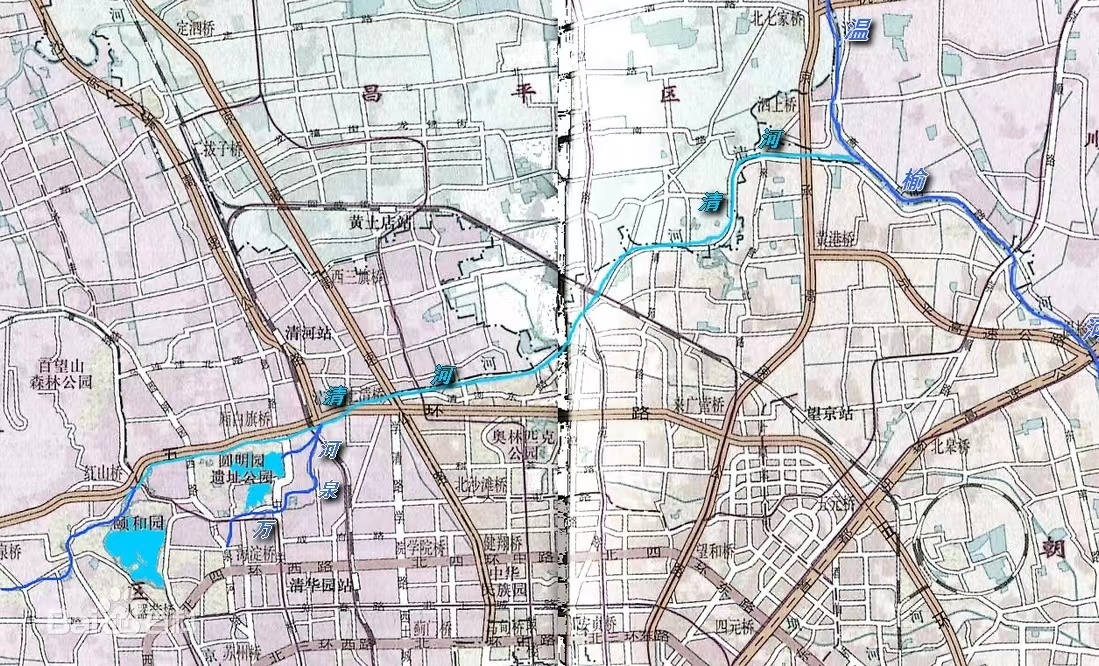 清河,上游为从北京市海淀区颐和园西北角的安河闸起(北长河(京密引水渠)与北旱河汇合处)东北流,经肖家河、朱房村、清河、河北村、立水桥、沈家村、沙子营后,在立水桥以东入温榆河。清河水源有二:一是西山之山洪及泉水沿北旱河进入,二是玉泉山泉水沿北长河进青龙闸在安河桥汇入。1978年治理清河,裁弯取直河道,缩短为23.7公里),流域面积150平方公里。