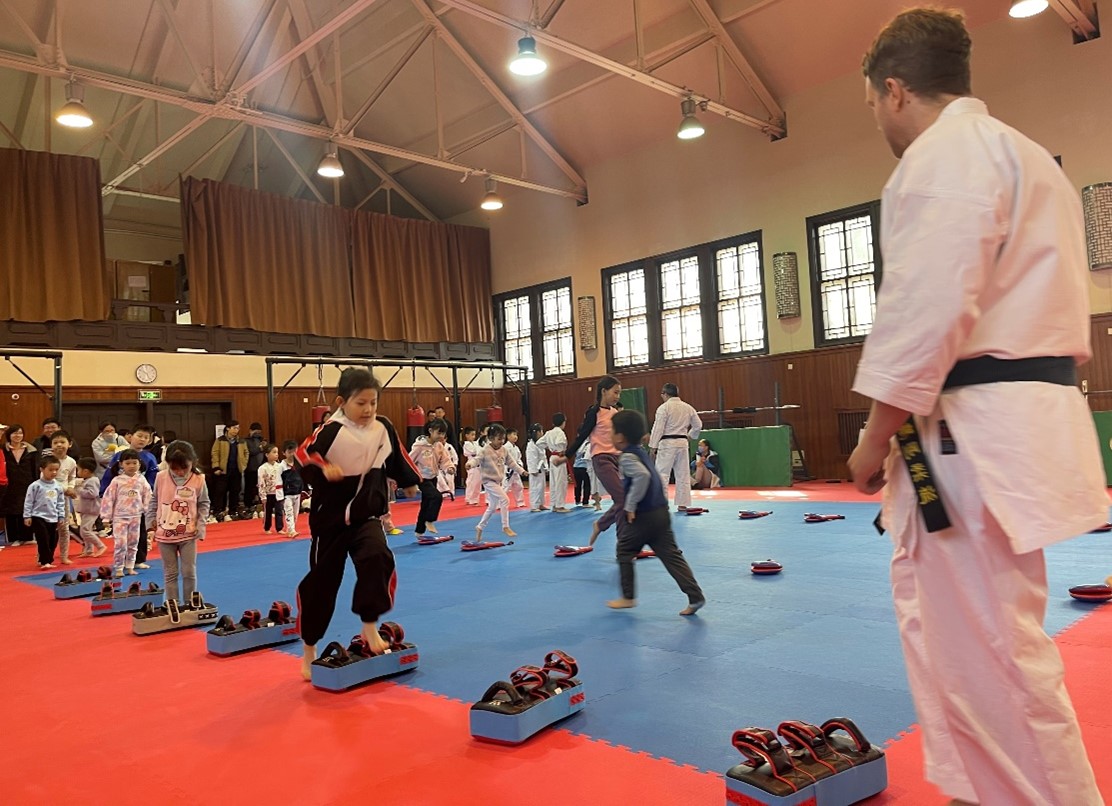 随后,老师们教了基本的出拳、防护、踢腿等动作,小学员们学得都非常认真。喊号子时,新学员们惊奇地发现,除了中文,还有英语和日语。老师还安排了很多有趣的跑、跳等练习和游戏,学生们都很开心地努力完成各个项目。
