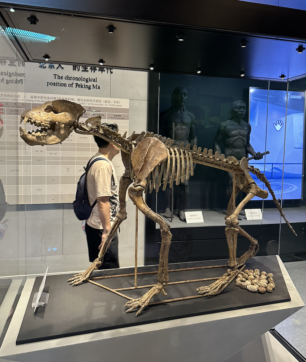 冯玥老师首先介绍了参与周口店遗址发现和发掘的历史,其中就有北京大学地质学系毕业的、1929年发现“北京人”第一颗头盖骨的裴文中先生。小朋友们目睹了距今约70万年的北京人头盖骨碎片模型、肢骨、牙齿等珍贵化石,了解了人类发展演化的不同阶段,还有当时生存的动物遗存如完整的中国鬣狗骨架。