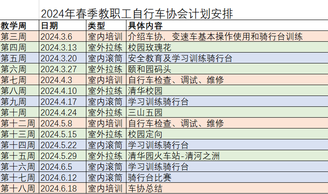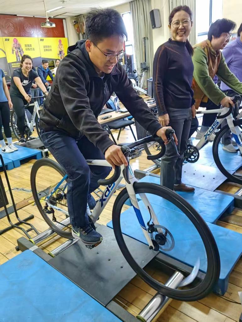 协会日常训练活动只有周三中午一小时,团队骑行还要兼顾风景和人文历史。协会在原有传统活动的校园玫瑰花(31人)、颐和园码头(17人次)基础上,加深对三山五园(22人)和清河之洲(14人)线路的熟悉,并尝试新线路清华校园(19人)和校园定向(10人)。这学期,协会大大增加了会员喜欢的自行车维修(25人、16人)和骑行台训练(23人、6人)的次数。三次室内骑行台训练为6月12日骑行台挑战赛打下了基础,14人参加比赛,创下教职工短距离四项记录。协会每周训练充满团队的凝聚力和协作精神,日常训练不仅是一场场体能训练,更是一次团队合作和个人成长的历练,让每个参与者都收获了难忘的体验。