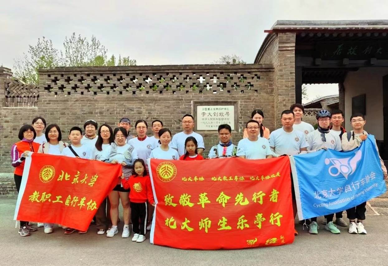 在五四运动105周年纪念日来临之际,北京大学老中青三代骑行者以“奋斗者正青春”为主题,从北京大学燕园校区出发,一路骑行至中国共产党主要创始人之一李大钊同志的故里河北省唐山市乐亭县,以此纪念李大钊同志,弘扬五四运动的爱国精神和青年的奋斗精神。教职工车协秘书长卢福泉任总策划,北大车协创始人康小明校友任团长,教工车协秦辉东任领队,教工车协奚斌任新闻组长,骑行团队由车协校友、教工车协会员、在校学生车协会员17人组成。他们经过三天约290公里的骑行,途经宝坻、唐山,最终抵达乐亭。北大骑行团队参观李大钊纪念馆,观看了由北大师生创作演出的音乐剧《大钊先生》,与来自北京大学的其他师生一同参加了在乐亭县李大钊纪念馆举办的千人朗诵活动,以此表达对革命先辈的深切缅怀和崇高敬意。北大骑行团队向乐亭县捐赠图书资料和参加签名队服仪式,在乐亭县自行车俱乐部和蓝天救援队的护送下,骑行团队往返骑行40余公里,参观了李大钊故居。对于每位成员来说,这次骑行活动不仅是一次身体上的远征,更是一次精神上的朝圣。