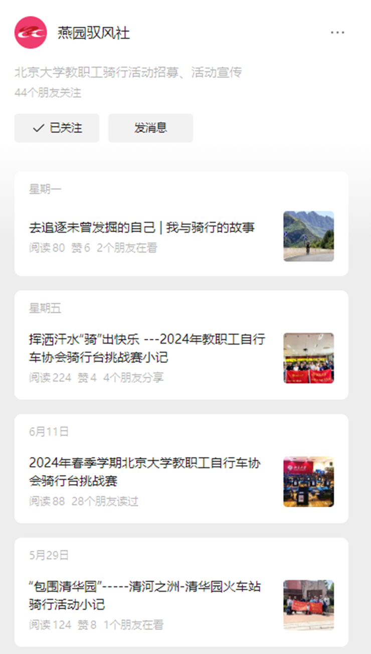 4月2日,协会第一次建立了“燕园驭风社”微信公众号,用于发布活动招募通知和活动宣传。这学期共发表10篇推文,阅读量1075。目前正在进行“我与骑行的故事”征文活动,欢迎新老会员投稿。