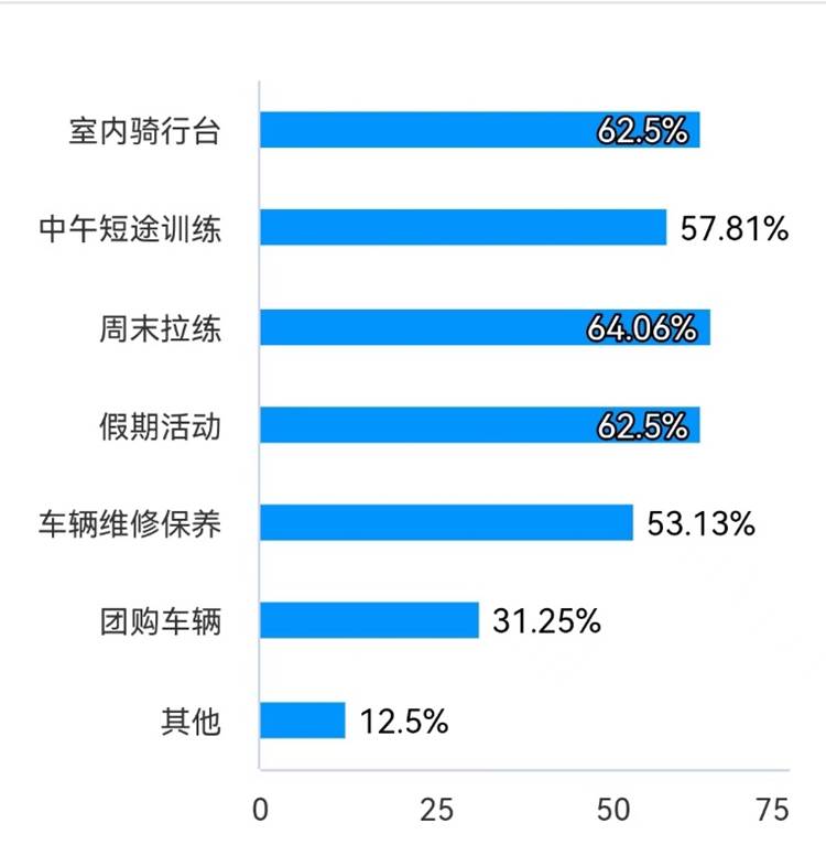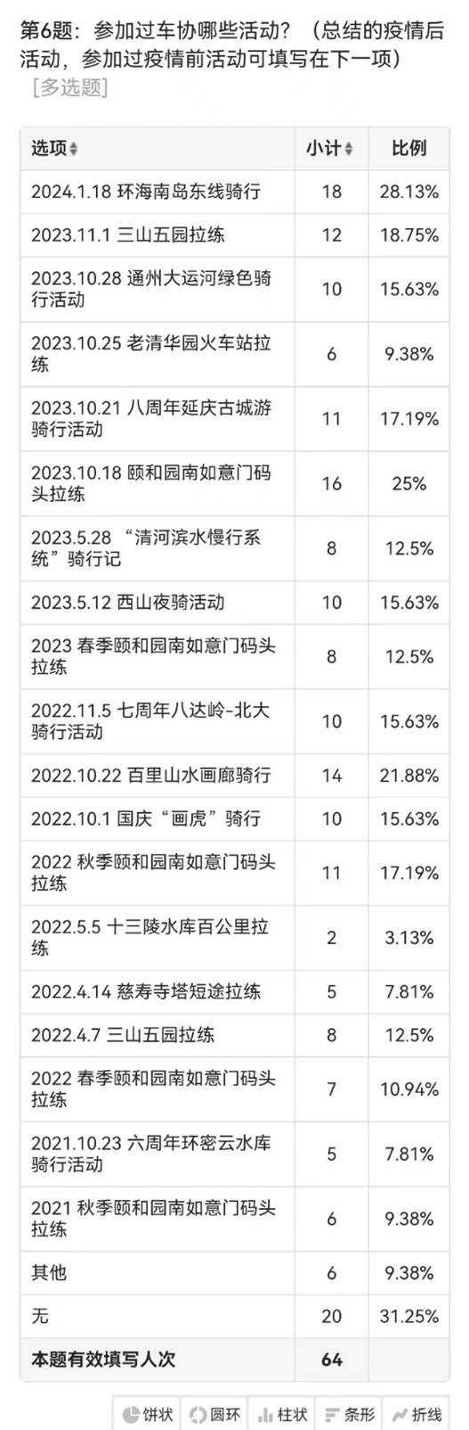 为更好服务会员,协会第一次对会员的基本情况进行摸底问卷调查,一周时间共收到64份,分别来自36个单位,男24女40,大部分会员集中在近三年加入的,80%的会员有变速车,38人骑过骑行台,62%的会员参加过三年内的中长途拉练,希望参加的活动前三项为周末拉练、假期活动、室内骑行台。