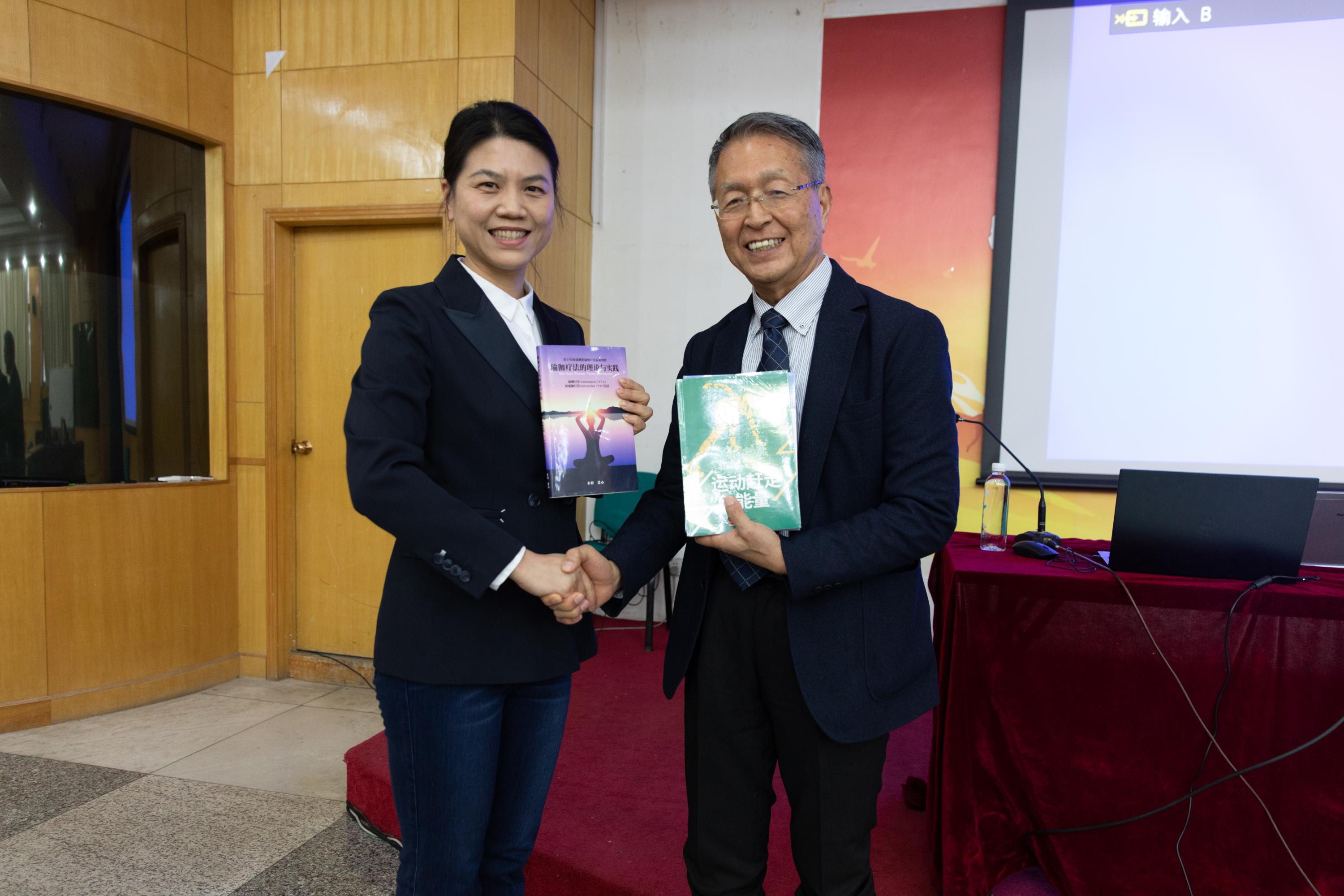 亓昕和木村慧心互赠专著,并表示今后将进一步加强交流,推动瑜伽疗愈研究和师生常见病治疗方面的合作。