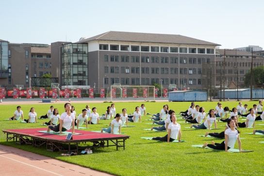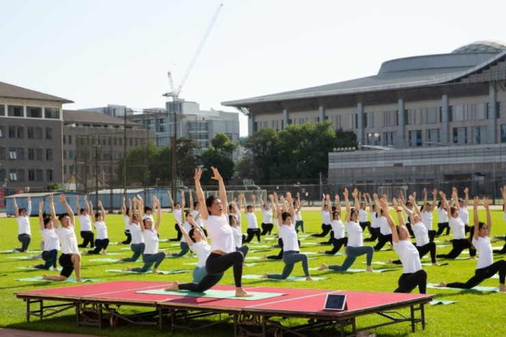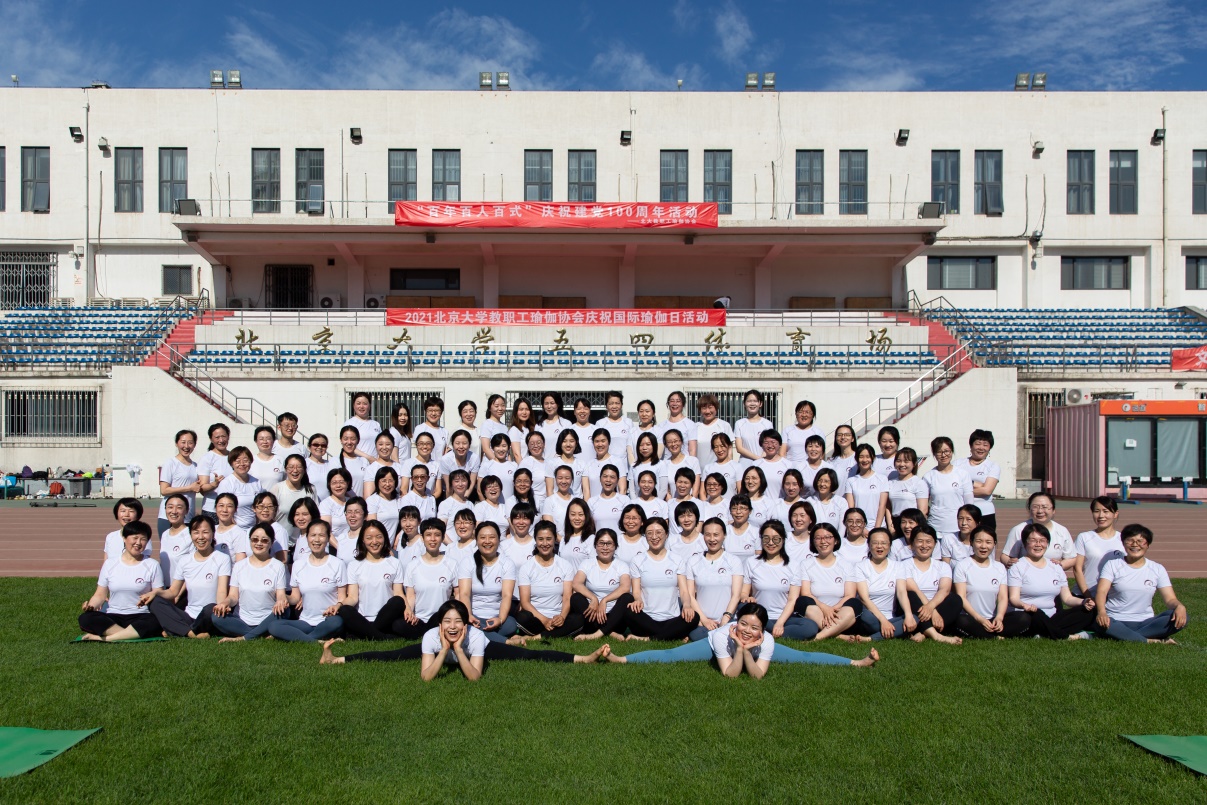 瑜伽协会还在本学期组织进行了一场重要活动。为献礼七一建党百年和庆祝621国际瑜伽日,协会于6月20日上午在五四操场草坪上举行了“百年百人百式”瑜伽展演活动,从前期策划到实施,社团骨干们都付出了很多努力和坚持。在工会的大力支持下,活动得以进行并取得圆满成功。活动信息发布后,两天之内就吸引了超百位师生报名和参加。在亓昕老师的组织、带领下,活动参加者们提前几天进行了认真的集中彩排,最终瑜伽展演活动成功举办,百位师生在“我和我的祖国”歌声中展演经典的瑜伽拜日体式,为全校建党百年系列活动增添靓丽色彩,也身体力行为国际瑜伽日造势。