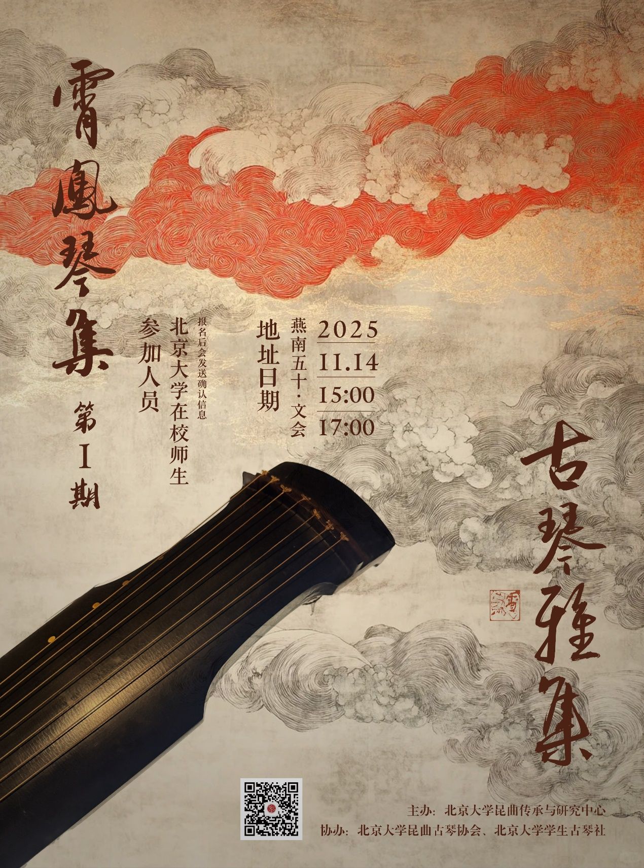 2025年11月14日下午三时,霄凤琴集(第一期)于北京大学燕园校区燕南五十文会厅成功举办,来自北京大学、清华大学和中央音乐学院的中英两国近二十位师生琴友参加了雅集。本次古琴雅集由北京大学昆曲传承与研究中心主办,北京大学昆曲古琴协会和北京大学学生古琴社协办,并得到北京大学工会与北京大学会议中心的大力支持。