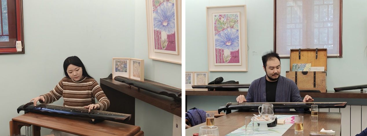 本次活动不预设曲目,现场不设置扩音设备,师生在轻松的氛围中抚弹丝弦古琴,对比不同材质琴弦的特色,探讨不同琴派的的用指特点并分享习琴心得。校内师生杨楠楠、孙夕雯、黄中辰、程鹏源、张晓蕴等人弹奏《雉朝飞》(陈长林据《神奇秘谱》打谱)、《捣衣》(朱子易传谱)、《流水》(卫仲乐传谱)、《平沙落雁》(广陵派传谱)、《袍修罗兰·水》(成公亮作曲)等曲目。窗外嘉木葱茏,厅内丝桐漫响,古朴典雅的燕南园也因这松风琴韵又添了几分静谧与清逸。