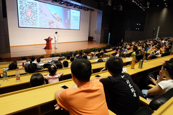上午9:30,进入科技馆后的第一项活动是聆听科普讲座“昆虫和它们的亲戚”,本场活动是由果壳网科学人科普作者、从事跳小蜂科分类研究的张小蜂老师主讲。