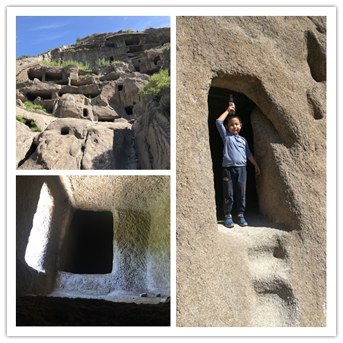大家拾级而上,小心翼翼钻进洞穴里,借助手电筒微弱的光一探究竟。石室的洞口毗邻,位置错落有序,石室一般高1.8米,呈长方形或正方形,其中以一明两暗的三套间居多。洞穴内的高度一般为1.5—1.8米,深为1—6米不等。各个洞穴内分别凿有石门、石窗、石炕、石灶、马槽、壁厨、气孔、排烟道等,一应俱全,留有许多人类生存的痕迹。