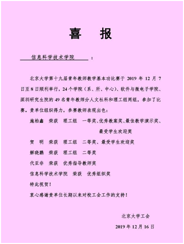 北京大学第十九届青年教师教学基本功比赛于2019年12月7日至8日举行,信息科学技术学院3位青年教师参赛,表现突出,均获得优异成绩。施柏鑫荣获理工组一等奖、优秀教案奖、最佳教学演示奖、最受学生欢迎奖,贺明荣获理工组二等奖、最受学生欢迎奖,解晓鹏荣获理工组二等奖,代亚非荣获优秀指导教师奖,信息科学技术学院荣获优秀组织奖。