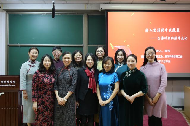 深衣经流年,服饰传雅韵。11月25日下午,信息科学技术学院工会、数学科学学院工会特别邀请到那氏传统旗袍第三代非遗传承人、灵犀坊旗袍创始人、旗袍设计师徐冬以“融入生活的中式服装——民国时期服饰文化”为题在理科一号楼1114教室举行主题讲座。信息学院工会主席冯梅萍、副主席王晶云,数学学院工会副主席郑春鹏参加讲座,近50名老师亲临现场,共同感受中国传统服饰的时尚魅力。