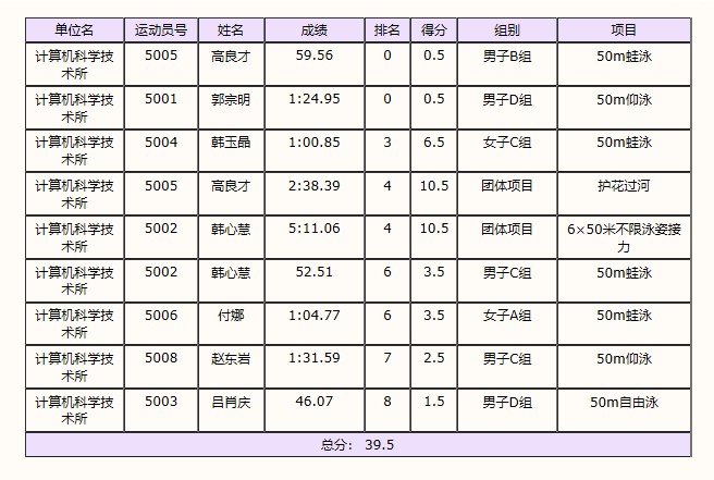 本届比赛的压轴项目是今年新增趣味团体赛--护花过河接力赛,作为新增项目,各队均没有经验借鉴,在裁判宣布比赛规则后,各队立即展开练习、摸索技巧。发令枪声一响,各队老师们施展着五花八门的技能,或推着,或拉着,一条条泳道掀起朵朵浪花,呼喊声、尖叫声把整场比赛的推向了高潮。计算机所组成的“荷花队”,凭借着“使者们”的实力以及顽强拼搏的精神,拼尽全力将美丽的“荷花”护送到目的地,在大家共同的努力下获得第四名。