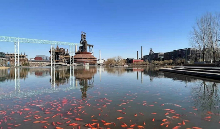 冬奥会和冬残奥会组织委员会办公地址在首钢园秀池湖畔。秀池原为高炉工艺冷却水的晾水池,是炼铁工艺的重要组成部分。现在是首钢园大型水面景观。微风徐徐、湖面涟漪,高炉铁塔倒映在湖水里,成群结队的金鱼在高炉铁塔的光影间畅游,女同胞们惊叹着力量与柔美的完美结合,不同角度拍照,把自己的身影嵌入其中。