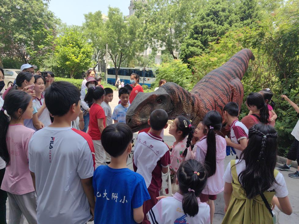 此外,小朋友们还在场馆门口与大型仿真恐龙互动。这一互动给此行增添了别样的乐趣。