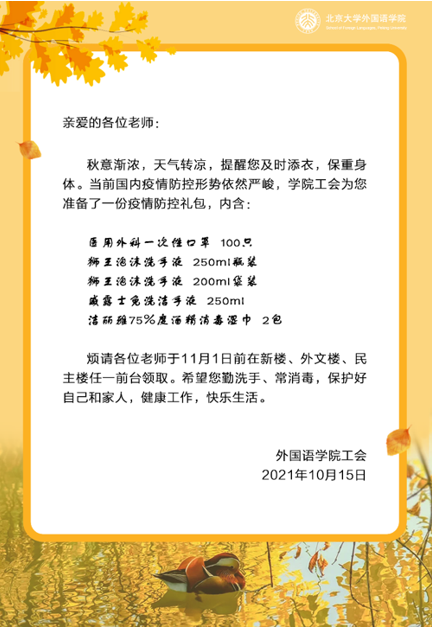 外国语学院工会委员会目前设有16个工会小组,工会会员465人(含保留工会会籍的离退休人员208人)。在北京大学工会及学院党委的领导下,在行政系统积极的配合下,外院工会不断推进自身建设,在推动学院民主管理、职工参与、提高教师技能、关爱教职员工、促进教师职业发展、丰富文化生活等方面发挥了积极作用。在疫情防控常态化期间,以各种方式慰问、关心职工,传递温暖和爱心。在日常工作中,充分发挥桥梁纽带作用,切实推进“我为师生办实事”实践活动。