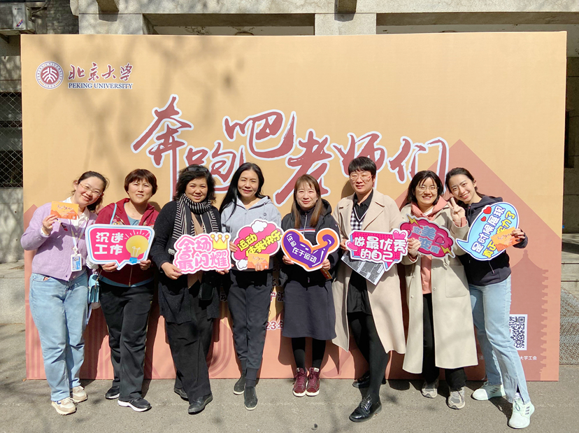 在和煦的阳光下,外国语学院党委书记李淑静、工会主席张冬梅带领外院女教职工在工会老生物楼前集合。北京大学党委副书记、副校长、党委统战部部长、北京大学女教授协会会长宁琦来到现场看望参加活动的外院女教职工,并与大家亲切合影。在现场工作人员的指引下,大家领取集章卡后迈着轻快的步伐出发。