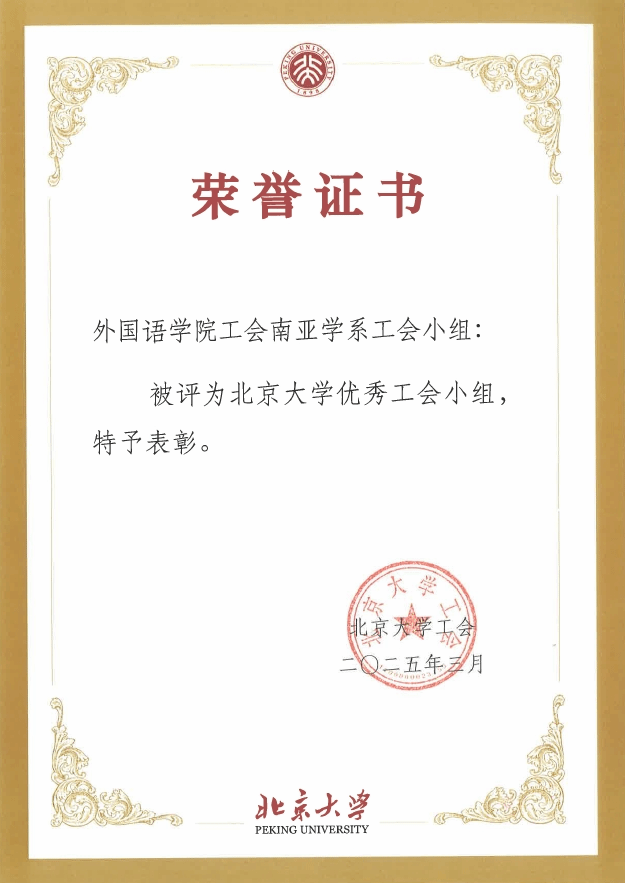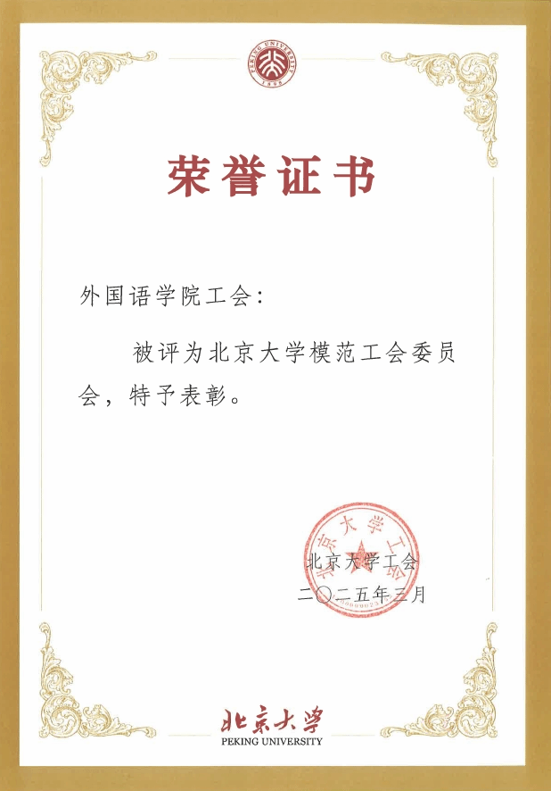 根据《北京大学工会先进集体和优秀个人评选表彰办法》,经基层工会推荐,评审小组评审,校工会主席办公会讨论,工会常委会审议通过,外国语学院工会荣获2023、2024年北京大学模范工会委员会,南亚学系工会小组荣获2023、2024年北京大学优秀工会小组,外国语学院教工舞蹈协会和外国语学院教职工瑜伽社团荣获2023、2024年北京大学优秀教职工社团。