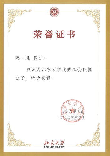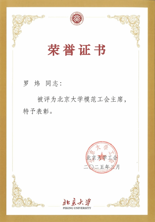 校工会授予罗炜老师2024年度北京大学模范工会主席称号,授予张冬梅、王靖、陈静三位老师2024年度北京大学优秀工会干部称号,授予冯一帆老师2024年度北京大学优秀工会积极分子称号。