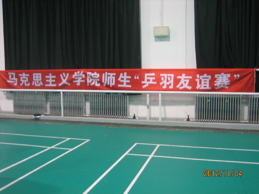 下午1点,寒风、白雪中熙熙攘攘地走来了一群人,他们从校园内外、四面八方会聚一堂来参加“马克思主义学院2012年师生乒羽友谊赛”!比赛总共分成3支队伍――教师队、研究生队和成教队。三队各出2名男单、1名女单、男双1对、混双1对,可以有1人次兼项,采取5局3胜制。为了增加比赛的观赏性和趣味性,赛制要求全循环,即使一队已取得胜利,也要打完全部比赛。