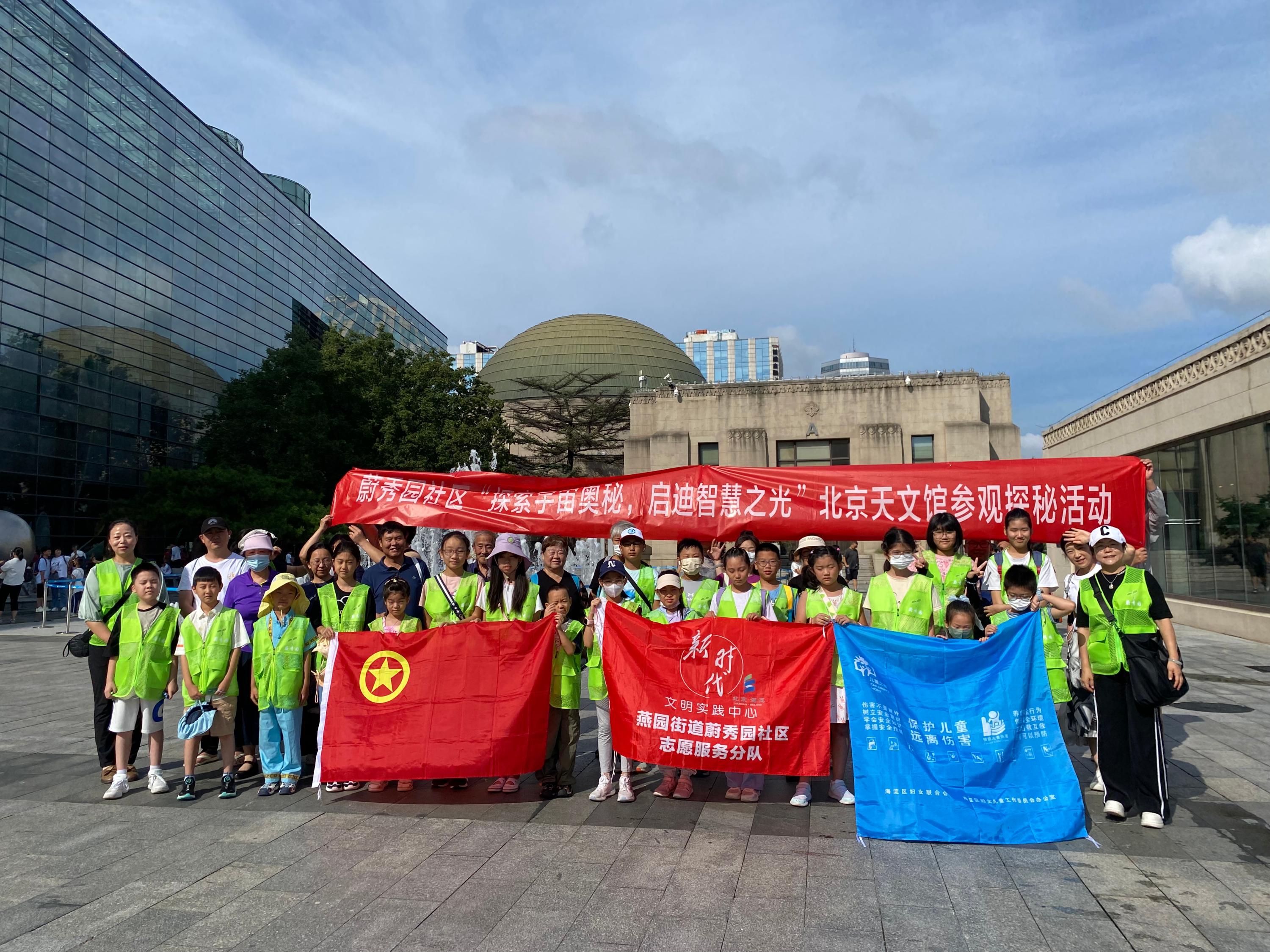 8月21日上午,蔚秀园社区组织辖区内的青少年前往北京天文馆开展参观活动。23组家庭在工作人员的带领下,一行48人首先到达北京天文馆A馆中央,大家观看精彩的球幕天象节目——奇妙的星空,身临其境感受太空绚丽和壮观的景象。