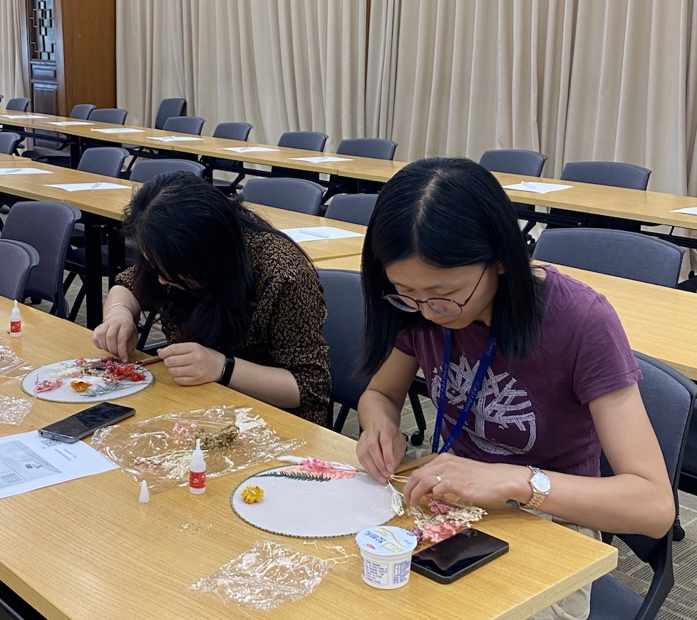 附中四十余位教职工参与团扇制作活动。老师们首先了解团扇的历史和基本制作技巧,教练指导大家如何在素面团扇上进行创作。