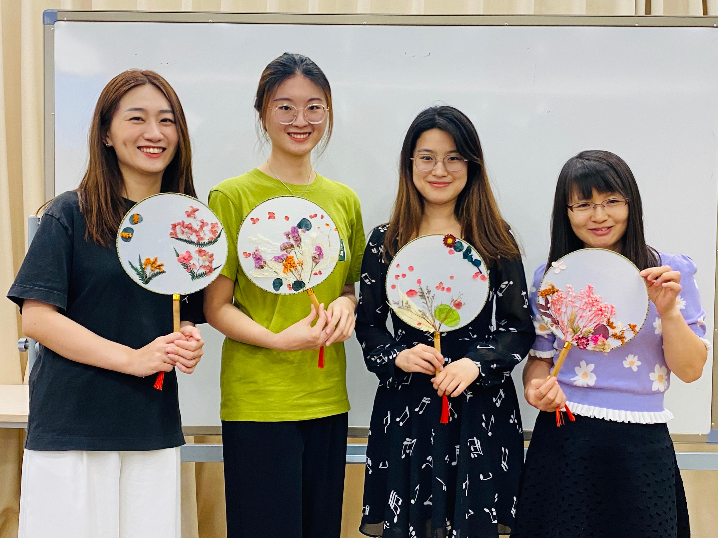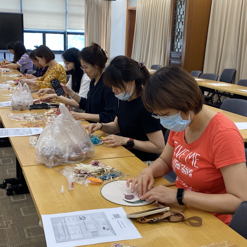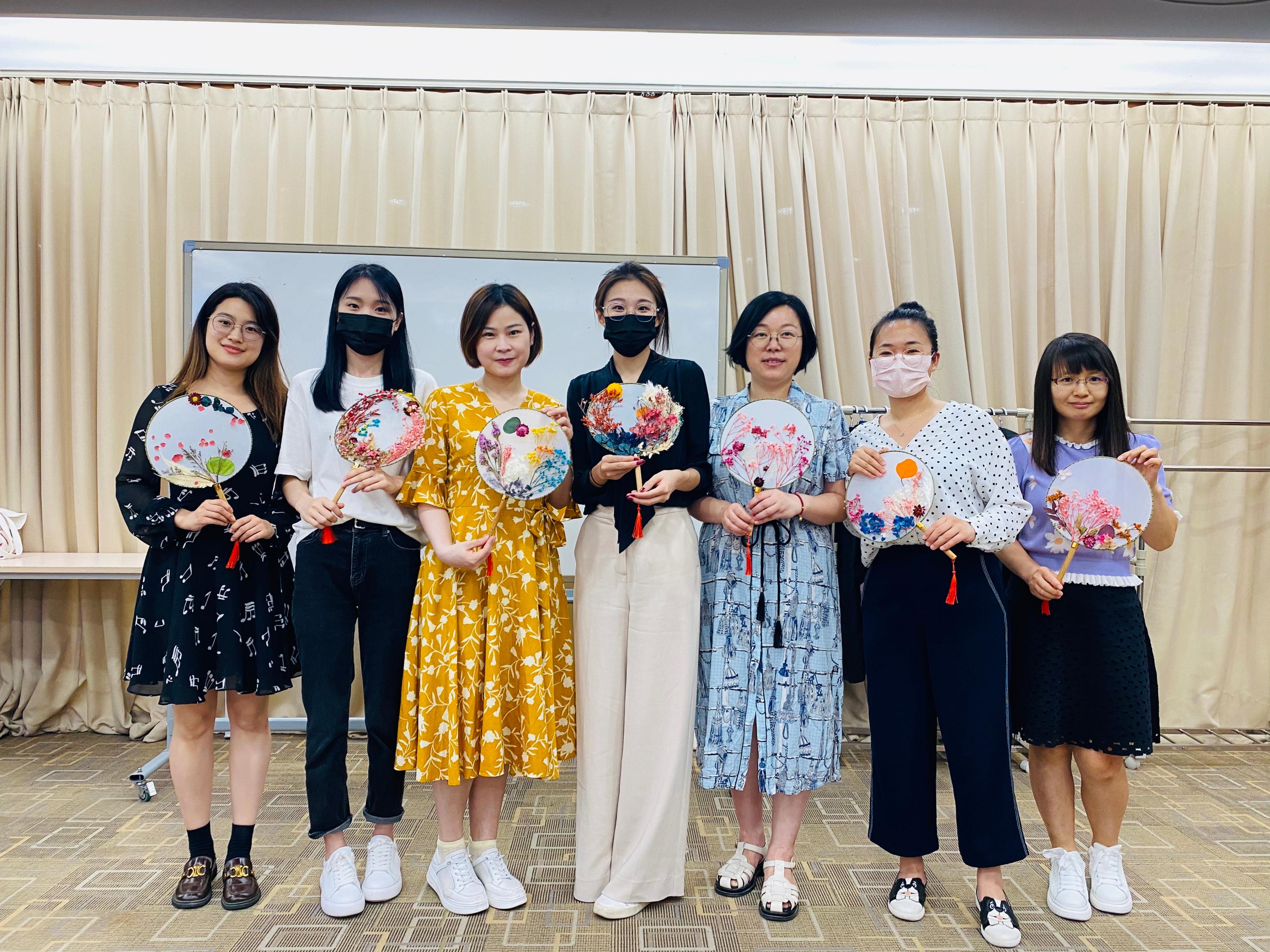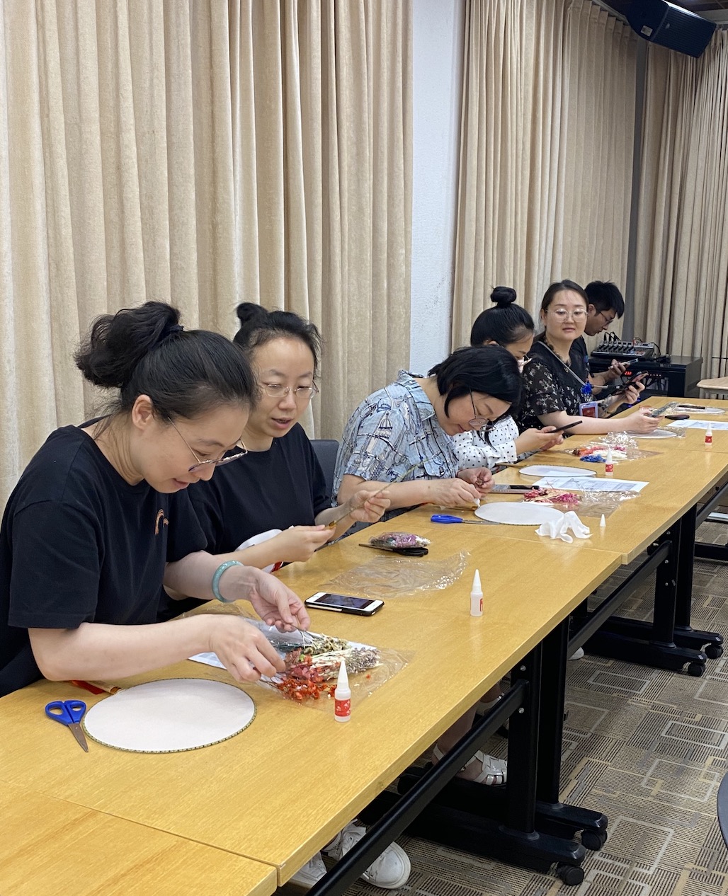 自己完成作品后,老师们互相交流,取长补短、相互鉴赏,在欢乐的笑声中,动手动脑中体验团扇制作。