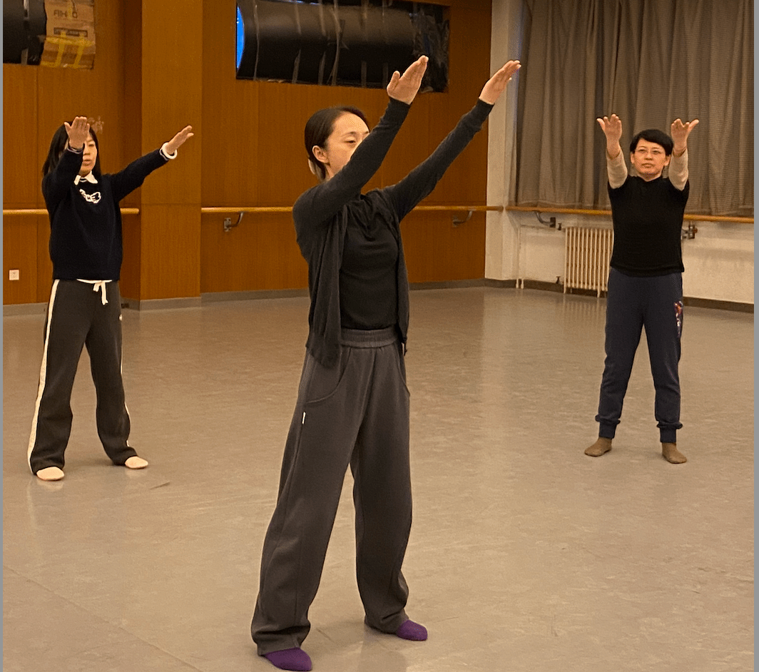 课程开始后,附中舞蹈教师章程细致耐心的指导前来参加活动的老师们,从基本站姿到舞步分解,从节奏感知到情绪融入,逐步引导学员感受民族舞的韵律之美与健身操的活力节奏。
