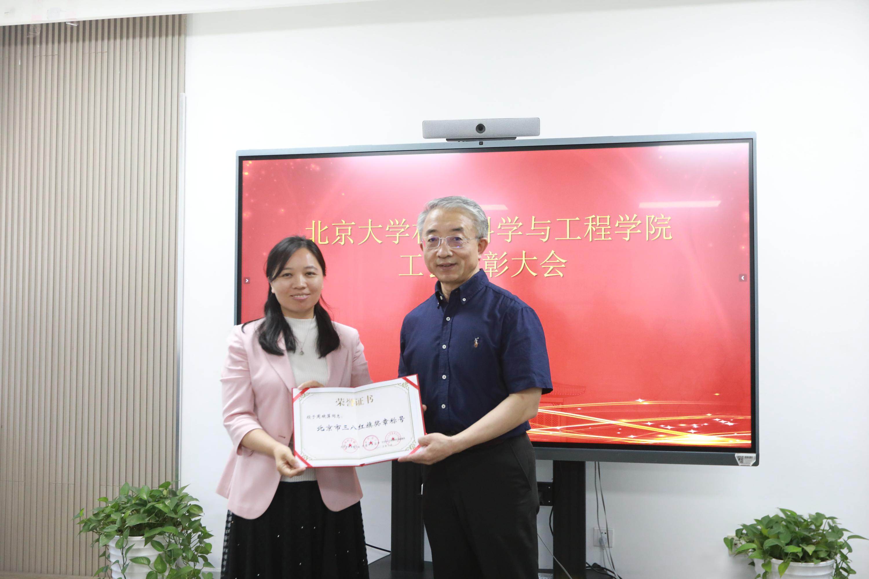 致辞后,安钰峰为周欢萍颁发北京市三八红旗奖章,张宝岭为材料科学与工程学院工会颁发北京大学先进工会委员会奖牌,校工会副主席张小萌为郭少军颁发北京大学模范工会主席证书。