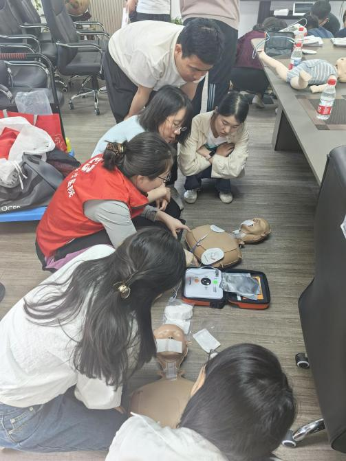 实践操作环节,医生们带来了专业的模拟人教具和AED 模拟设备,为老师们提供了真实的操作环境。教师们热情高涨,纷纷踊跃参与实践。在医生一对一的指导下,反复练习心肺复苏、AED 使用和海姆立克急救的操作动作。过程中,医生们对老师们操作不规范的地方及时纠正,确保每个动作都符合标准要求,老师们也纷纷表示从中收获良多。