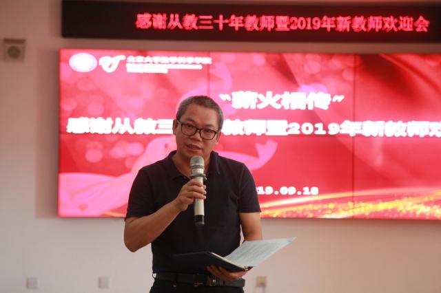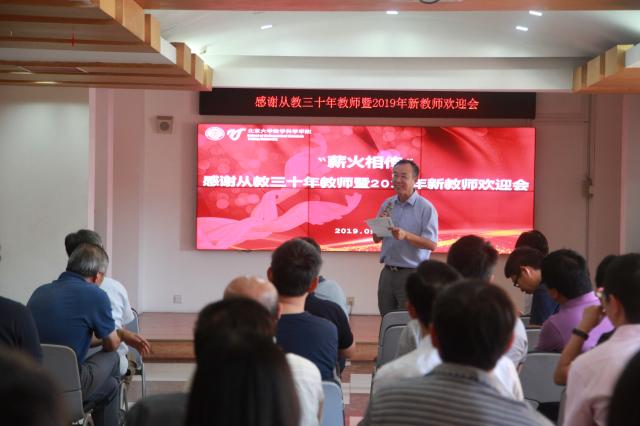 金秋九月,丹桂飘香。在这秋高气爽、阳光灿烂的收获季节里,新学年如约而至。2019年9月18日下午,“薪火相传”——感谢从教三十年教师暨2019年新教师欢迎会在北京大学理科一号楼1560教室举办。数学科学学院院长陈大岳,党委书记胡俊,副院长史宇光、李若,党委副书记董子静,工会主席周铁,副主席周蜀林、郑春鹏和学院的部分教职工参加了活动。活动由党委副书记兼副院长孙赵君主持。