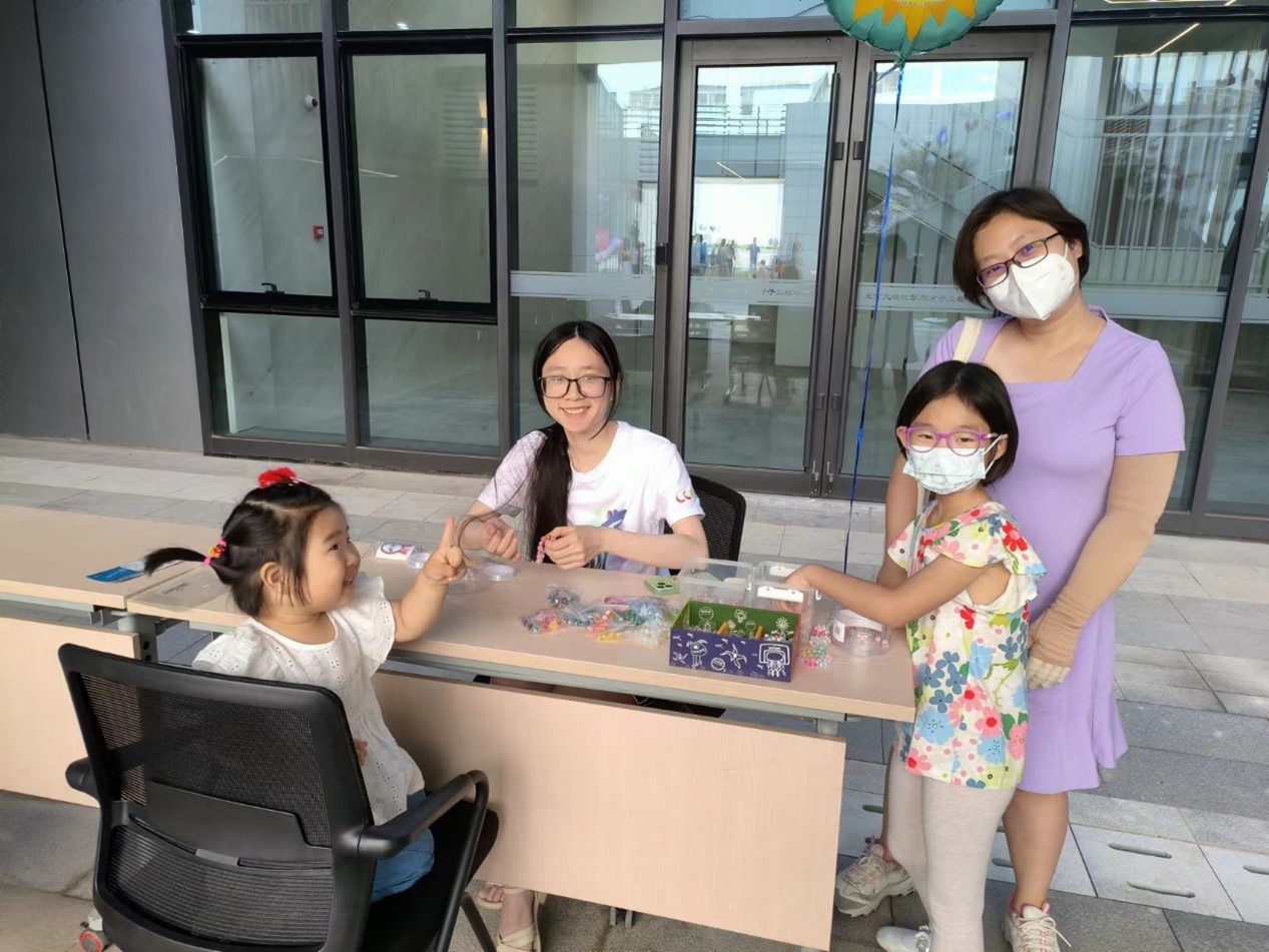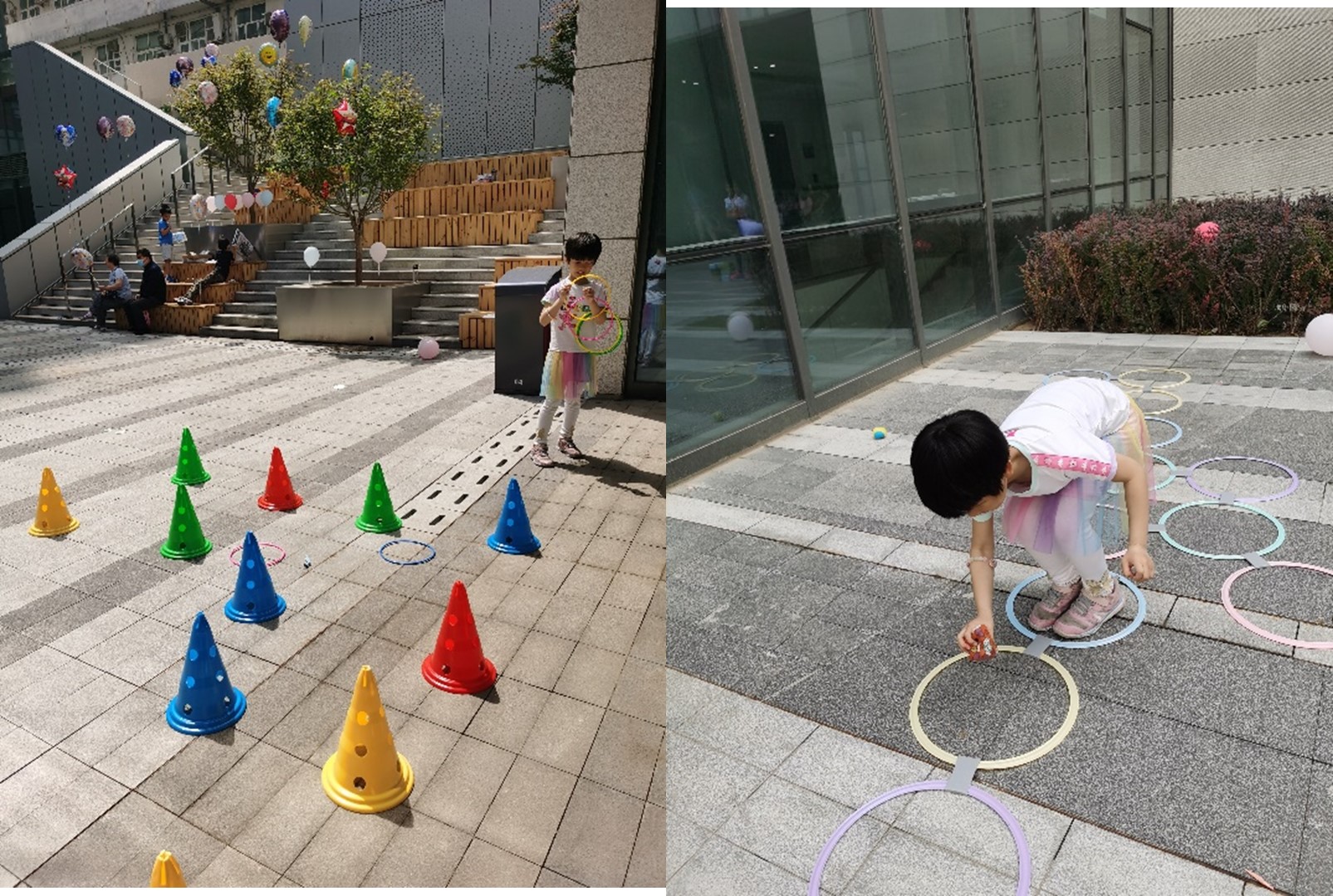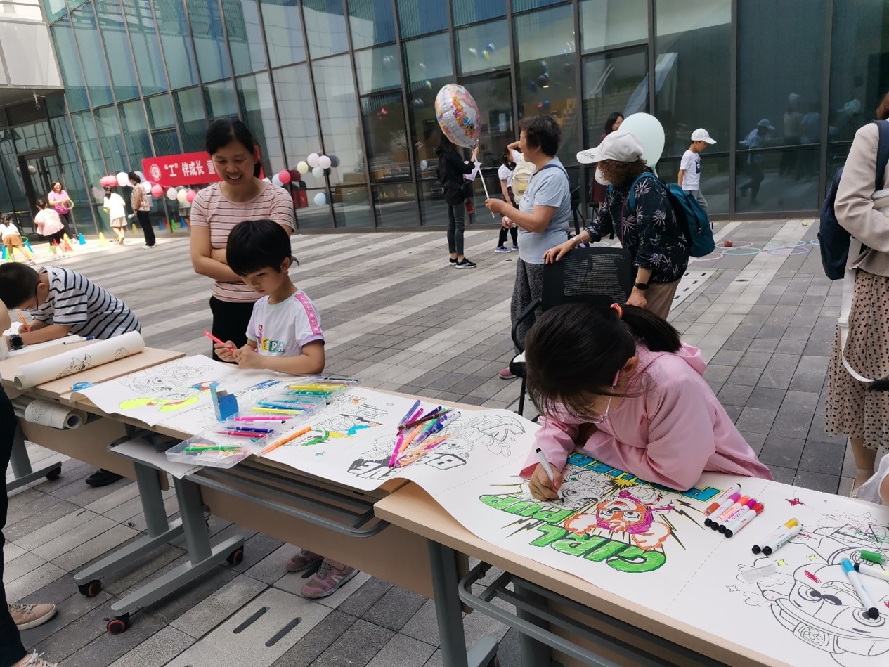 工会的老师们准备了多个小游戏:有卡通涂鸦、手工串珠、搬砖过河,还有在小朋友们看来有些“古老“但却满载着大朋友们童年回忆的套圈和跳房子。每参与一种活动,小朋友们可以得到一枚勋章贴纸。集齐五张贴纸就算完成任务,可以兑换任务奖励。