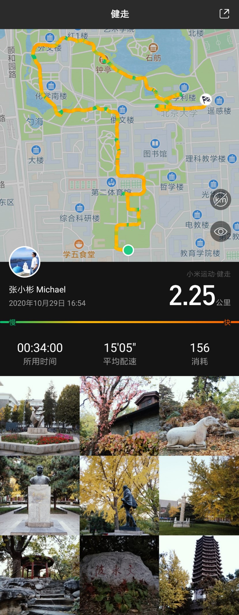 北京的秋是最美的季节,而燕园的秋更是美的让人心醉。金秋同时也是一个收获累累“硕果”的季节,但是化院的教职工往往会因为忙于工作而与北大的秋色擦肩而过,最后只能在朋友圈里欣赏一下中关村大街那面的二手秋景。为了倡导化院教职工积极锻炼健康生活,让化院的教职工抓住秋天的尾巴,在园子里与美景相遇,院工会发起了校园赏秋打卡的活动。工会负责组织活动的老师预先规划了赏秋路线,发布了9张校园中的秋景照片,包括:科学民主雕塑、燕南园、静园、李大钊塑像、塞万提斯塑像、西门大榕树、未名湖钟亭、文水陂和博雅塔,然后请参加活动的教职员工根据这9个景点的照片,利用空闲时间采用徒步方式到达其中6个景点并拍照打卡。本次活动受到了广大教职工的欢迎,经过两周时间共有116位教职工完成了打卡任务,使得更多的教职工在工作之余走出了户外,在秋高气爽的好时节徒步丈量了校园,消耗卡路里的同时欣赏了燕园秋色。