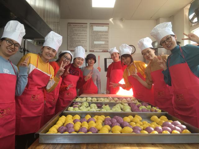 在学院食堂一楼操作间里,教职工们穿上崭新的围裙,戴上厨师帽,先由面点师傅向大家介绍花样面点的基本制作方法,之后大家开始揉面、擀面、包馅、造型等,一切都有条不紊。大家互帮互助,充分发挥想象力和创造力,气氛浓厚。1个小时之后,各式各样的创意面点出炉了,看到亲手制作的面点展现在面前,大家脸上带着一种满足感和成就感,品尝着自己动手制作的面点,纷纷夸赞又漂亮又好吃,每个人的脸上都洋溢着笑容。
