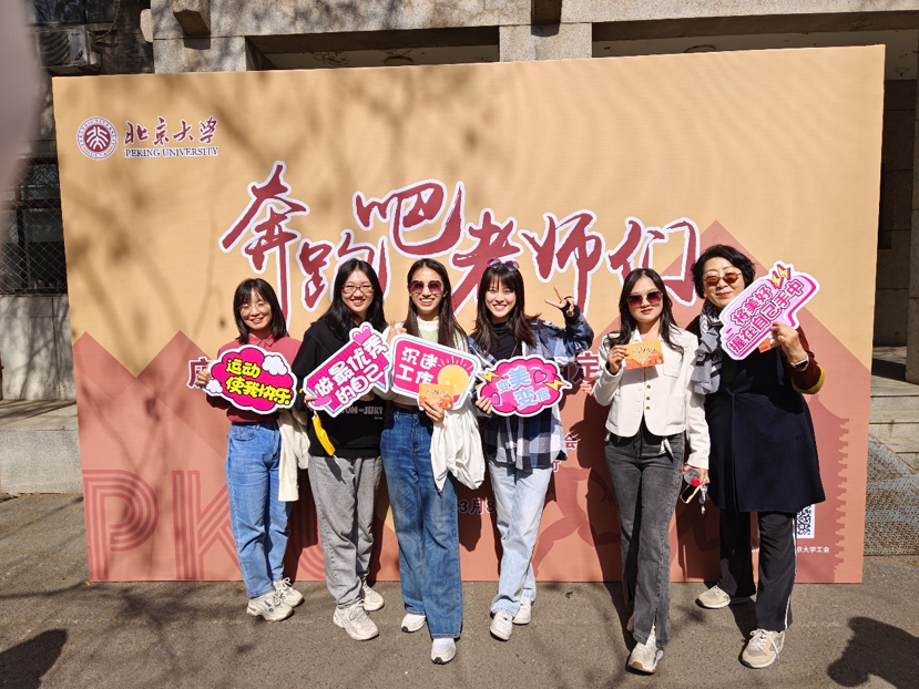 在和煦的阳光下,外国语学院党委书记李淑静、工会主席张冬梅带领外院女教职工在工会老生物楼前集合。北京大学党委副书记、副校长、党委统战部部长、北京大学女教授协会会长宁琦来到现场看望参加活动的外院女教职工,并与大家亲切合影。在现场工作人员的指引下,大家领取集章卡后迈着轻快的步伐出发。
