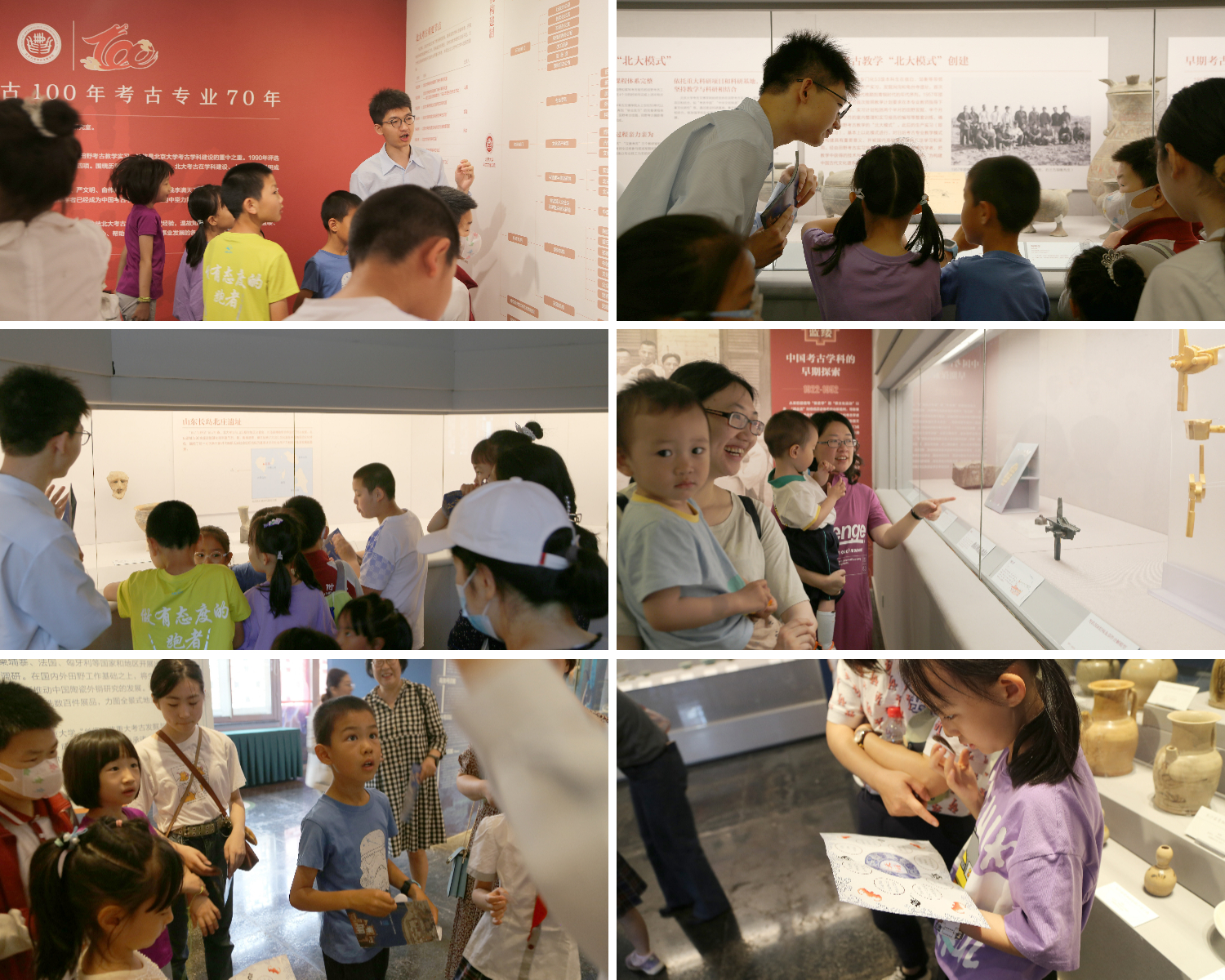 上午9时许,两院教职工及其子女在工会人员和博物馆志愿者的带领下进入赛克勒考古与艺术博物馆。在“北京大学考古100年考古专业70年特展”上,大家共同回顾了北大考古百年来的峥嵘历史。展厅四个单元的大事记与百余件(组)展品、图文展板,共同勾勒出北大考古的历史,也映射出北大考古的未来。小朋友们仔细观察现场展品,纷纷向负责讲解的志愿者同学提问,兴奋之情溢于言表,对中国特色、中国风格、中国气派的考古学有了初步的理解与思考。在“比邻天涯:北京大学藏古代外销瓷特展”上,大家参观了不同时期作为文化信使的中国外销瓷,并且参与集贴兑换小奖品活动。外销瓷是反映古代中国文化与世界各国文化交流互鉴的重要见证,此次特展分为七个单元,对应中国古代外销瓷的七个发展阶段,共计展出外销瓷300余件(组)。小朋友们认真观看精美瓷器展品,对瓷器的颜色、纹饰、造型、用途等都非常感兴趣,惊叹于我国自古以来制瓷技术的精湛绝妙,并按照宣传页上的指引,与家长在展厅中寻找对应的瓷器图样,收集贴纸。通过互动游戏,大家更为直观地感受到了中外文化的互动与融合,也对海上丝绸之路的辉煌历史与我国灿烂文化成就有了进一步的认识。