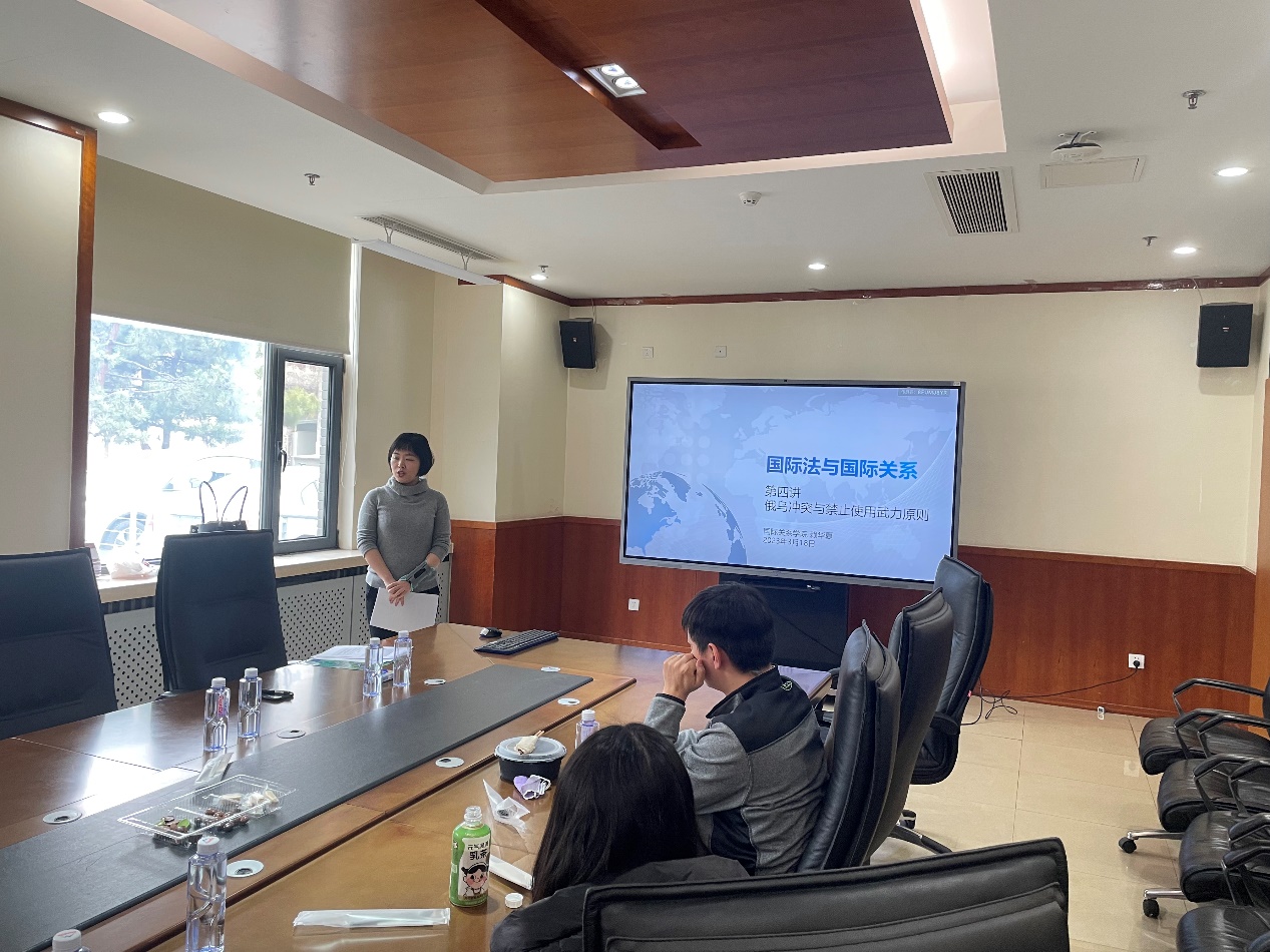 继第一轮讨论会后,赖华夏老师吸收学院领导和各位老师的宝贵意见,及时调整课程PPT和讲课重点,将“俄乌冲突”作为课程线索,在课程开始以“俄乌冲突”爆发一周年为切入口,引发学生针对俄乌冲突中涉及国际法“禁止使用武力原则”的条款提出问题,之后围绕国际法相关原则的历史变迁层层深入,并引用联合国集体安全机制,讨论“禁止使用武力”的范围,最后回归到“俄乌冲突”事件中,透过“俄乌冲突”来看国际法原则在国际关系中的发展和应用,以及二者是如何相互建构、相互作用的机理。