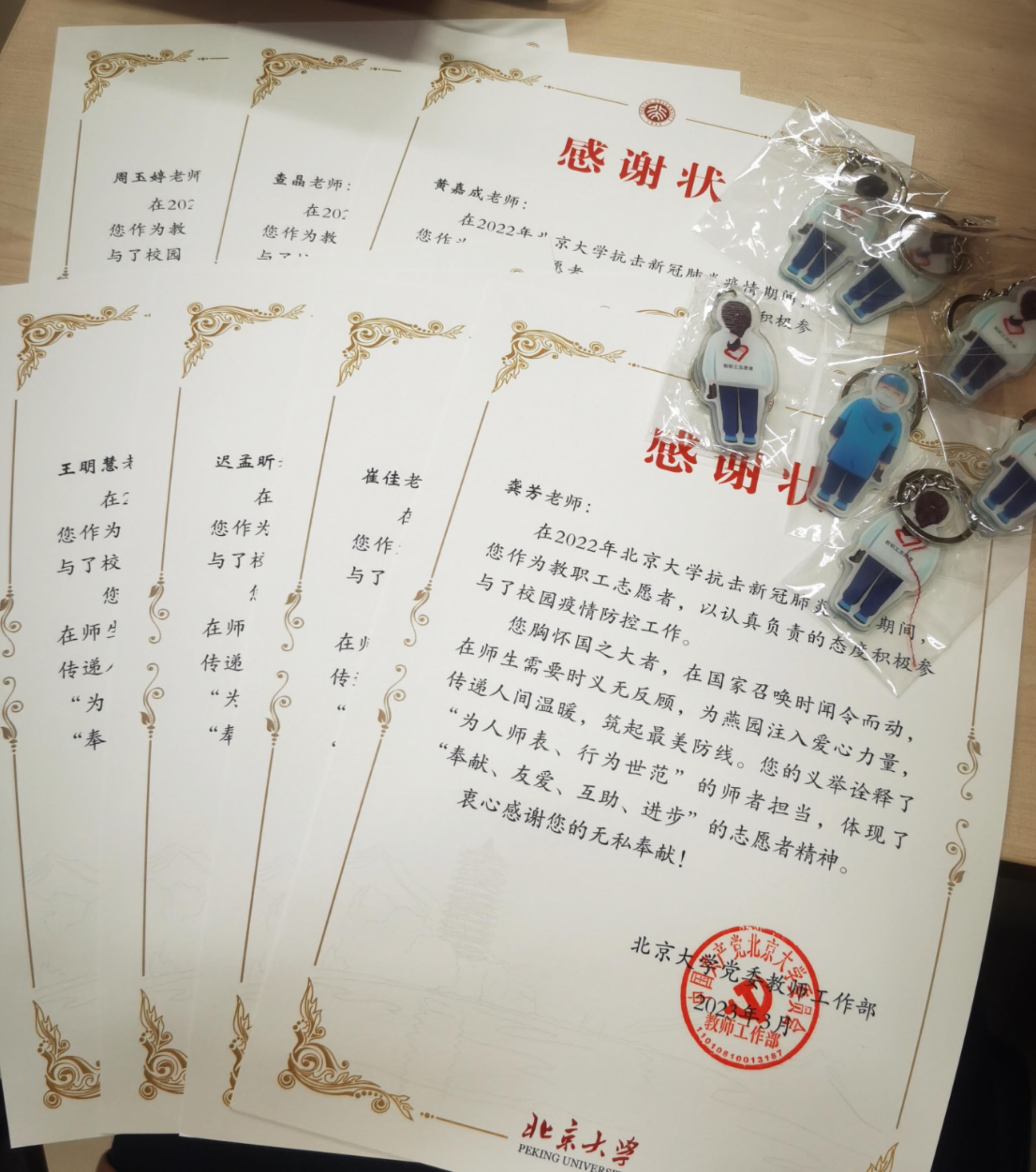 北京大学党委教师工作部在感谢状中表彰说:在2022年北京大学抗击新冠肺炎疫情期间,您作为教职工志愿者,以认真负责的态度积极参与了校园疫情防控工作。您胸怀国之大者,在国家召唤时闻令而动,在师生需要时义无反顾,为燕园注入爱心力量,传递人间温暖,筑起最美防线。您的义举诠释了“为人师表、行为世范”的师者担当,体现了“奉献、友爱、互助、进步”的志愿者精神,衷心感谢您的无私奉献!