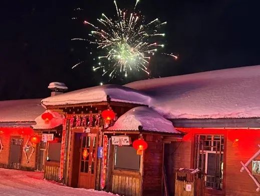 这是在黑龙江雪乡拍摄的一张照片,黑夜里绽放的烟花包含着人们对未来的无限憧憬,火红的灯笼与皑皑白雪映衬出春节的热烈气氛。