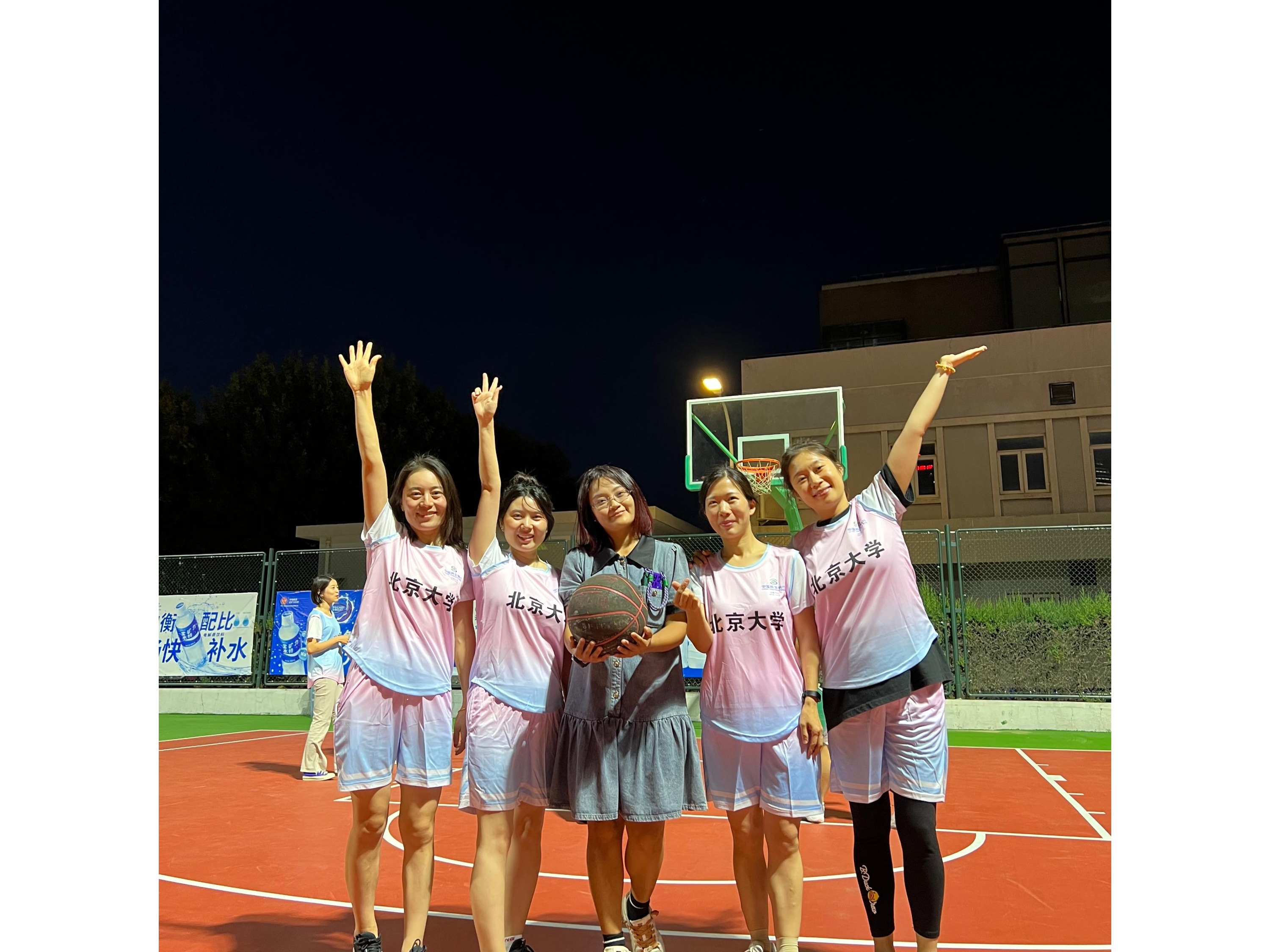 傍晚时分,崭新闪亮的五四篮球场上,裁判哨声响起,四名经院女子队员按顺序依次运球绕障碍进行接力。接力全部完成后,队员们迅速移动至篮下进行定点投篮。首先进行是一侧三秒区 0°角线定点投篮,1号队员首投不中、2号队员再投不中,大家不免紧张起来。经过一轮调节,终于,3号队员投中第一粒球!大家激动的欢呼起来。很快,队员们轮流投篮、迅速捡球、传球,一番团结协作,队员们先后完成了对面0°角线后、任意一侧三秒区线第四格45°角线后及对面第四格45°角线后、中间罚分线90°角线共五粒进球!在队员们努力拼搏一侧三分线内一步0°角中距离定点投篮时,比赛结束的哨声吹响。老师们在欢呼声中走下球场合影留念。