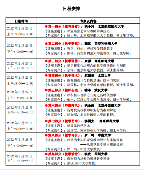 建设高水平师资队伍一直是我院高度重视的重点工作。2022年春季学期伊始,2月26日-28日,六场九项全能教学必修基本功养成线上培训,成为深圳研究生院教职工的开学首课,这也是我院工会积极履行教育引导职能,提升教职工综合素养方面的探索和努力。培训的指导单位是师培联盟(北京)教育科技研究院,培训设置了教学语言、教学研究、教学课件、教育技术、教学心理、师德师风、教学艺术、教学评价、教学设计等九个方面的课程,主要围绕教师开展课堂教学核心能力要素,同时还包括教师职业素养、教育理念等内容。