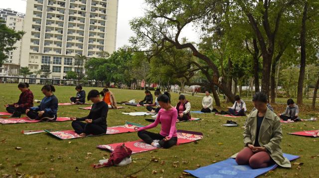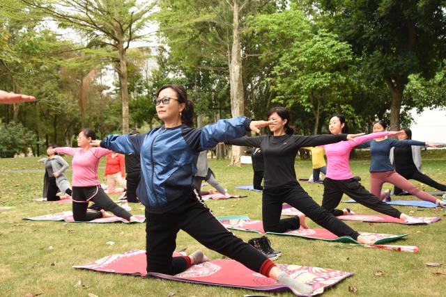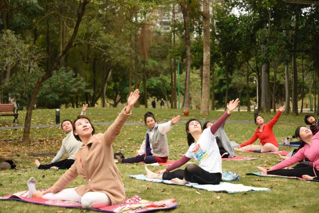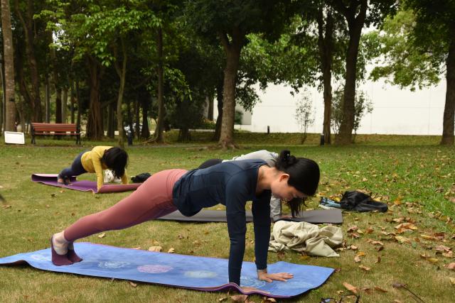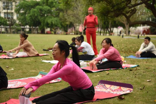 随后,老师们在瑜伽教练的带领下开始冥想、热身,在早春的校友林里通过简单注重拉伸的瑜伽动作舒活舒活筋骨、抖擞抖擞精神。她们中间有多年的瑜伽习练者,也有刚刚开始学习的入门者,不论动作是否完美,大家都尽力作到自己的最好,目光温柔而坚定,身体舒展且平衡。