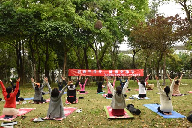 深研院工会在每年的妇女节都会举行一系列的活动,包含不同主题的讲座、户外瑜伽活动和发放会员电影卡。其中户外瑜伽依托工会的南燕教工瑜伽舞蹈社团举办,已经连续八年,成为工会传统项目之一。教工瑜伽舞蹈社团作为深研院历史最久、人数最多的教工社团之一,有一大批忠实会员,每学期开展的午间瑜伽课都有四五十人报名,常年坚持习练的会员也有近二十位。
