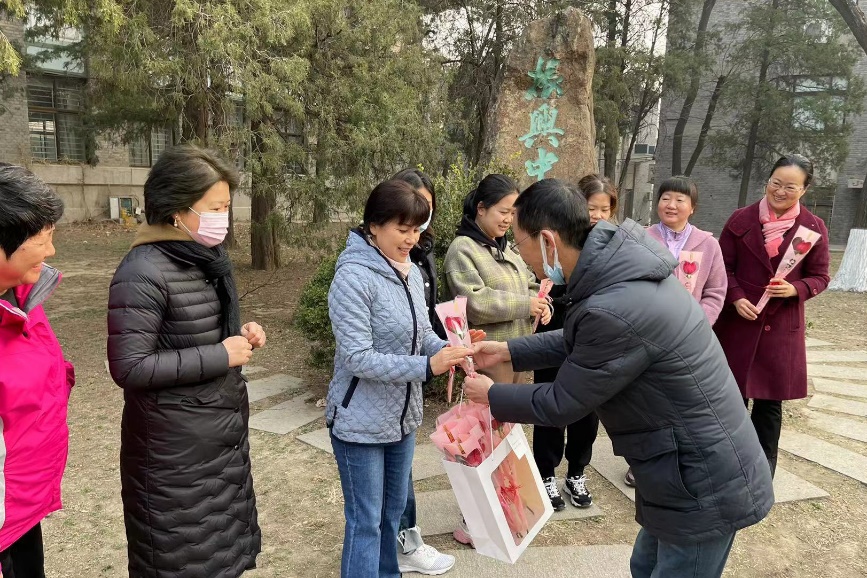 有单位的男领导为女士们集体送花,留下温馨的记忆。