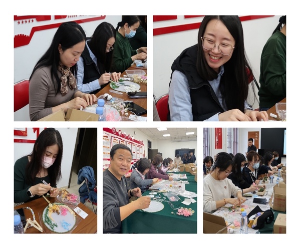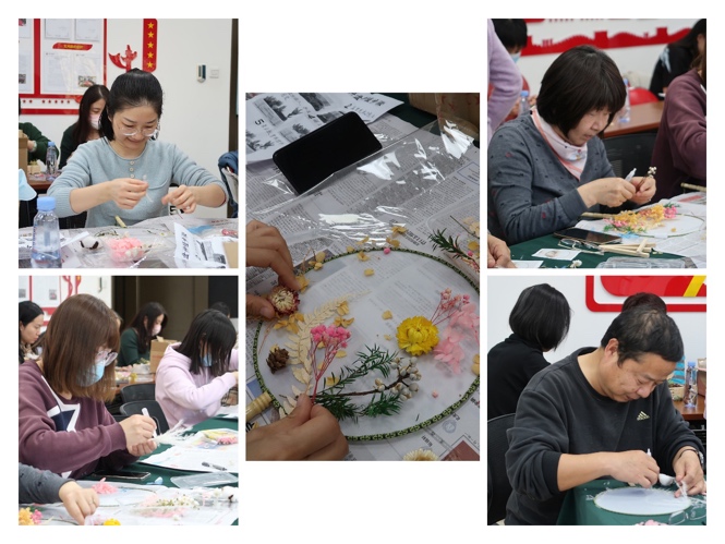 活动现场,工会委员和现场工作人员向大家介绍了团扇的制作方法。随后,大家认真地选材、设计造型,从架势、布局到色彩搭配……永生花一一点缀在素白的扇面上,细细构图、精心粘贴,原本空空如也的团扇瞬间变得“花团锦簇”。
