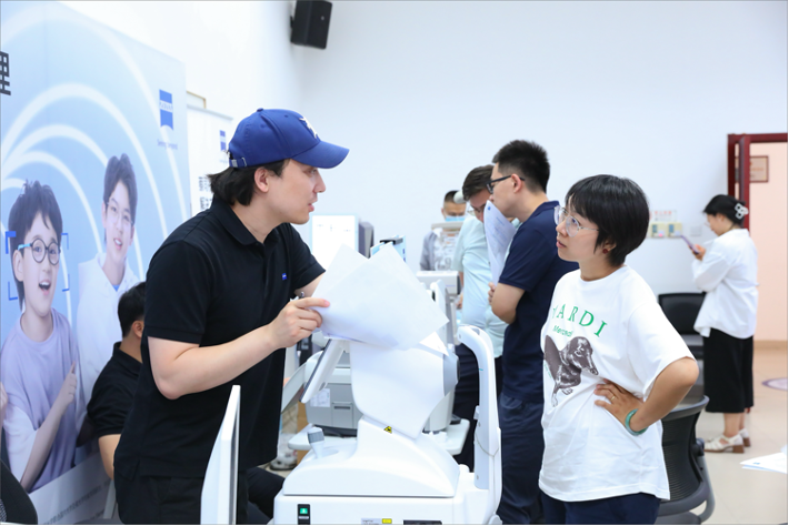 蔡司屈光分析仪、生物测量仪、IT.2……先进的仪器在勺园三层303会议室内一字排开。这些视功能检查设备,可完成视功能、眼轴、角膜曲率、眼底等眼部健康检查。本次是蔡司团队第二次到北大为机关老师开展验光配镜活动。与上次相比,这次团队带来“升级版”仪器,力求在基础验光服务的基础上,提供更精准、更全面的眼部检测。据其负责人介绍,“本次升级的生物测量仪采集的数据更加全面,可以在40秒内,对眼部整体情况和发展趋势进行评估,帮助老师们准确掌握眼部健康状况。以此为依据验光配镜,可以提出更加精准、更为个性化的解决方案。”
