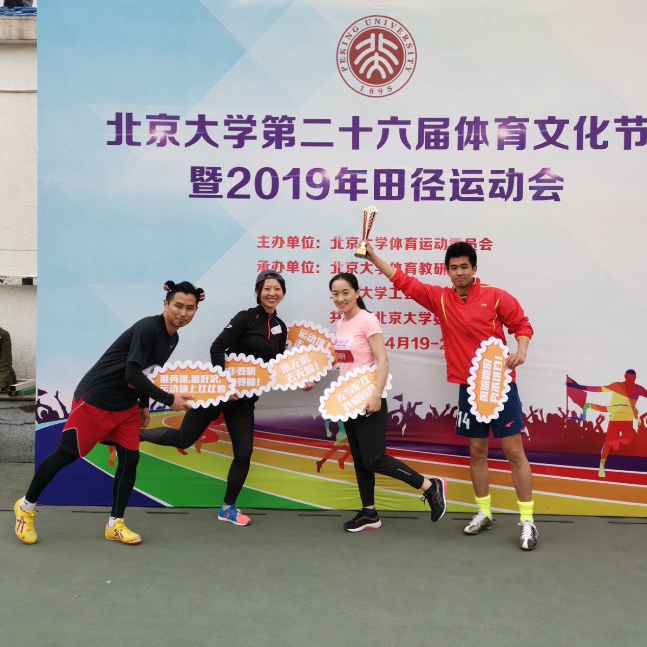 4月20日,北京大学第二十六届体育文化节暨2019年田径运动会开幕。机关各职能部门组成6支代表队参与了运动会各项比赛,并参加了开幕式太极拳表演。其中,机关两支队伍总成绩跻身前十:机关一队以320分的成绩取得团体总分第三名,机关二队以120分的成绩获得团体总分第十名,展现了机关队伍良好的精神风貌和奋勇争先的体育精神。