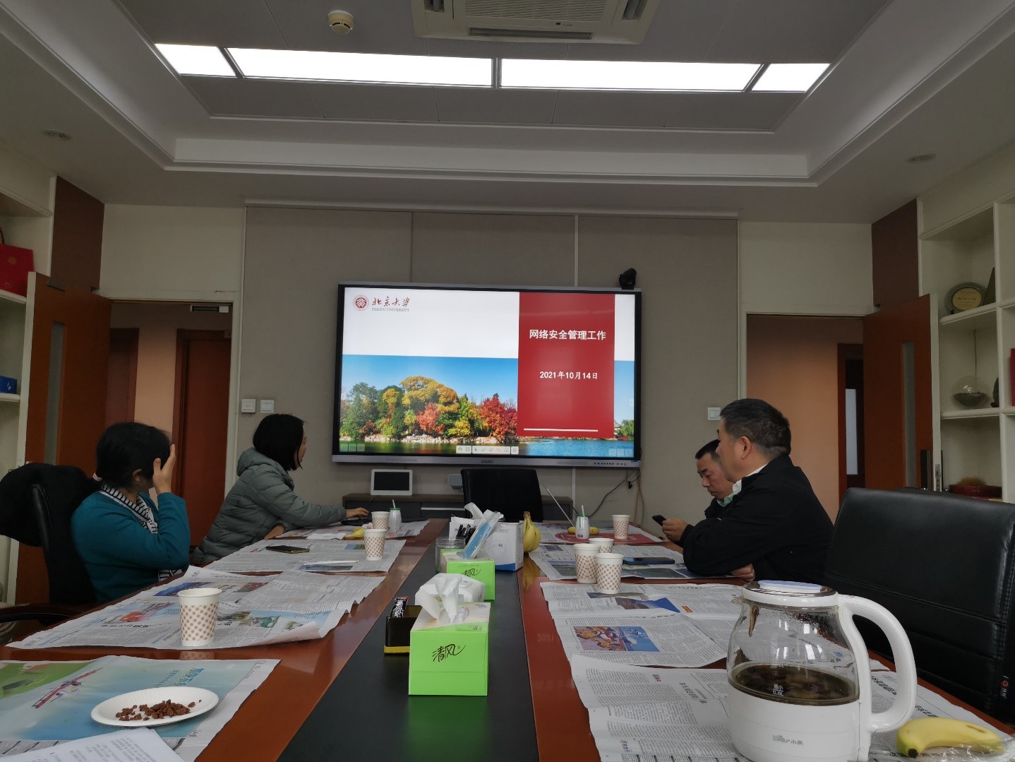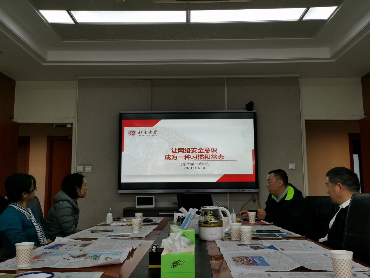 网信办资源管理办公室副主任陈晨向大家介绍了自网信办成立以来北京大学在网络信息安全方面做的主要工作,内容涵盖“建章立制、常规管理、风险预警、人员培训”四个方面。她重点解读了北京大学网络安全管理工作的管理办法、有关制度、以及相关平台,介绍了北京大学风险预警与处置的有关流程。