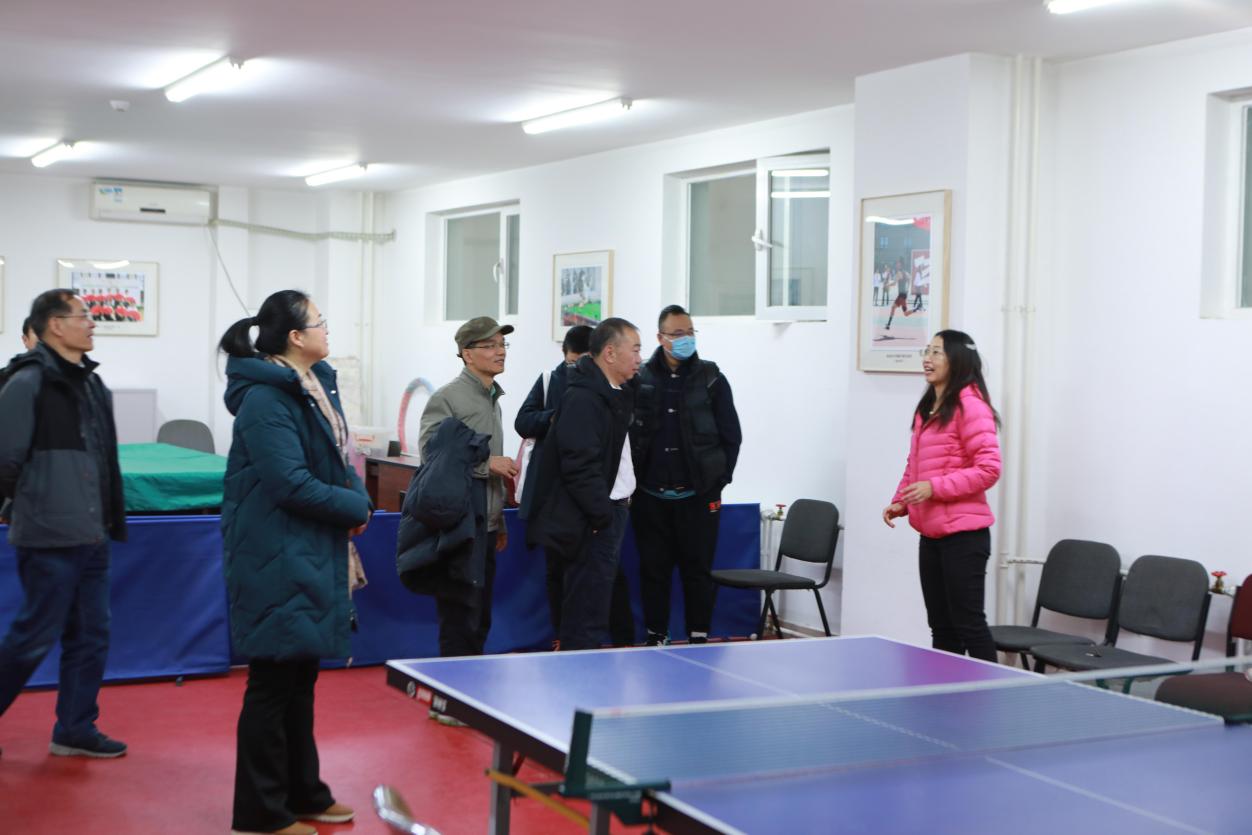 验收组成员在刘旭东和田越的陪同下查验了位于勺园的机关教职工之家乒乓球室、健身室等活动场所,观摩了悬挂在活动室和勺园展廊的活动照片。