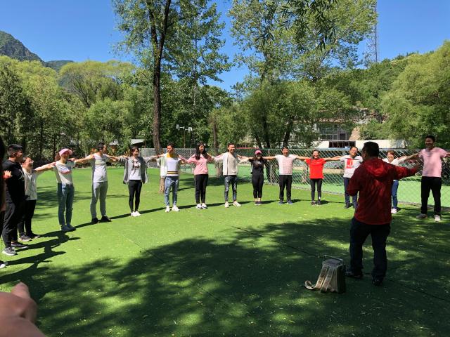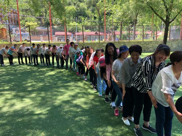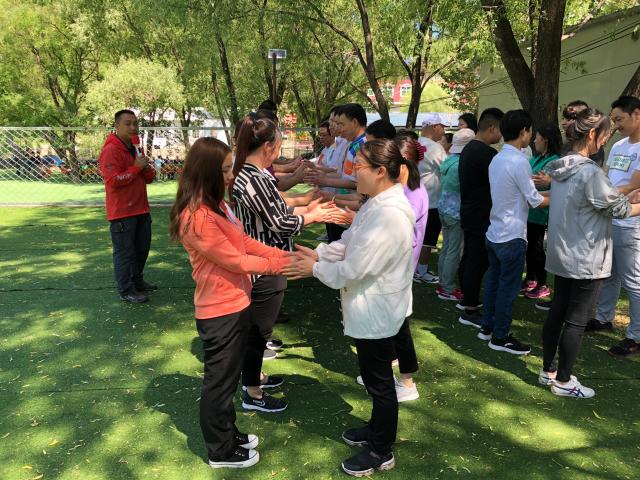 团建活动在一片轻松愉快的氛围中拉开序幕。教练带领大家以游戏互动的方式进行热身。长期在食堂工作养成的重效率、讲纪律、严谨、专注的良好习惯,使大家能够迅速排成整齐的队列,认真的聆听教练的讲解,全身心的投入热身游戏,手与手相对拍打测试反应能力,肩并肩彼此按摩放松。有趣而精彩的破冰分组活动,提高了个人的执行力和团队的协作能力,增强了成员间的信任感。