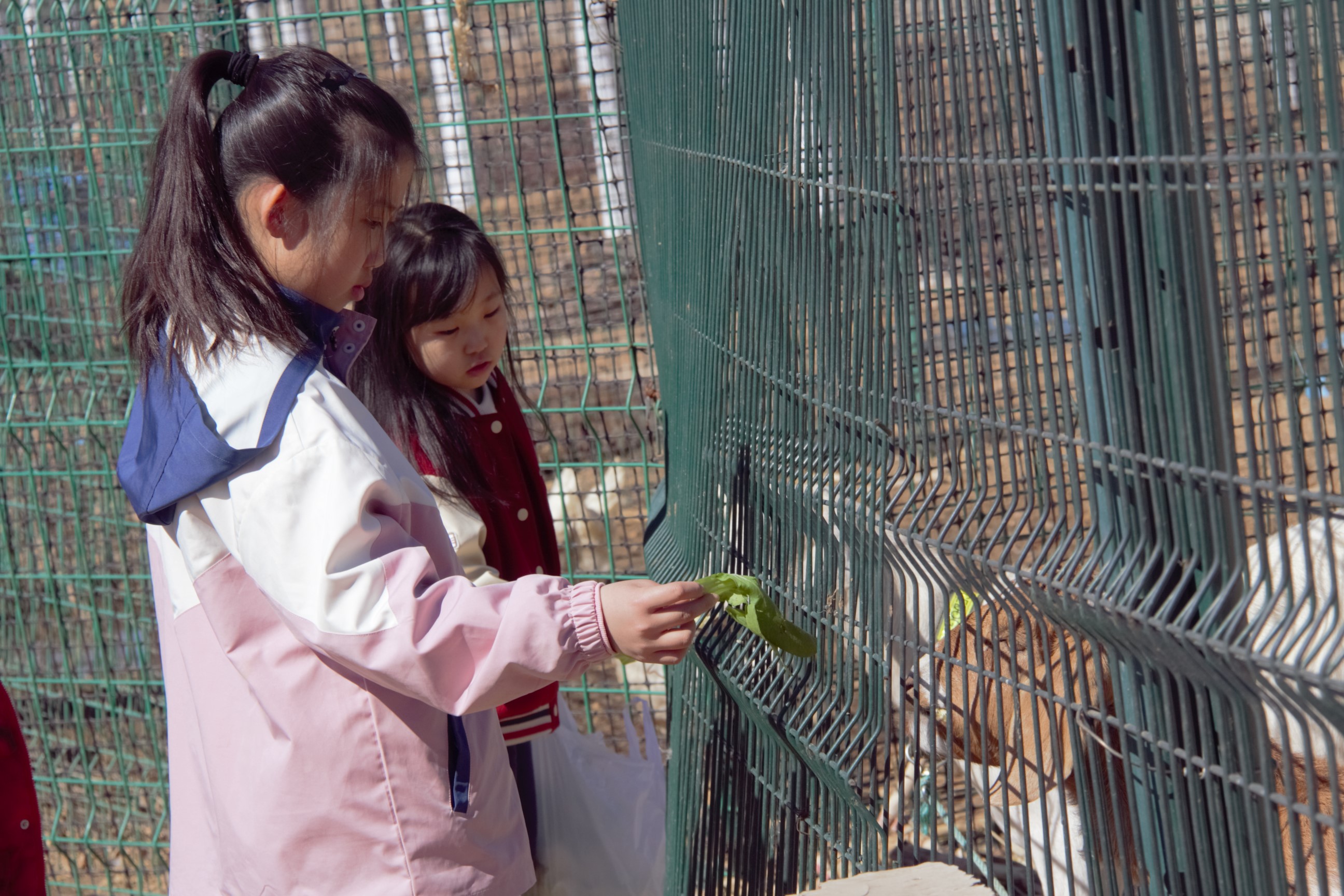 在短暂休整之后,参加活动的教职工和孩子们来到基地农耕体验区和动物天地,实际感受四季农耕劳作和小动物喂养。在农地耕作中,大家深切体验一餐一食从何而来;在小动物的亲密互动中,近距离喂养小动物体验跟动物的接触。长期在城市生活的孩子围着小动物挪不动腿,看见传统的农家石磨一个个争着上去试一试推一推。哪怕只是一根木板子横在沟槽之间,他们也当成独木桥玩的不亦乐乎。